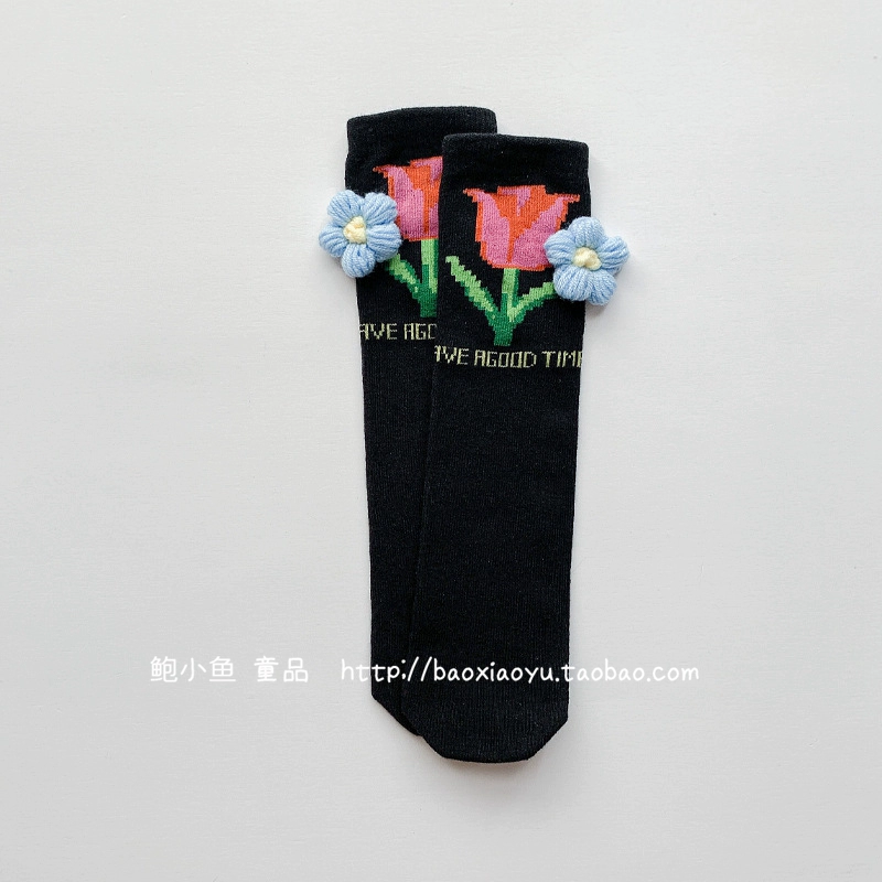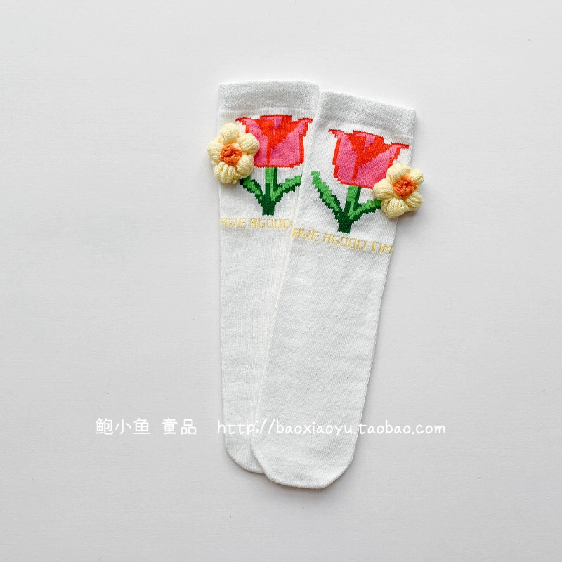 Spring retro style three-dimensional flower heelless mid-calf socks