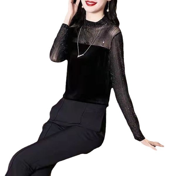 Spring Striped Long Small Collar Brassy Stitching Lace Base Shirt All-match Elegant Long Sleeve Top Base Yarn for Women