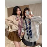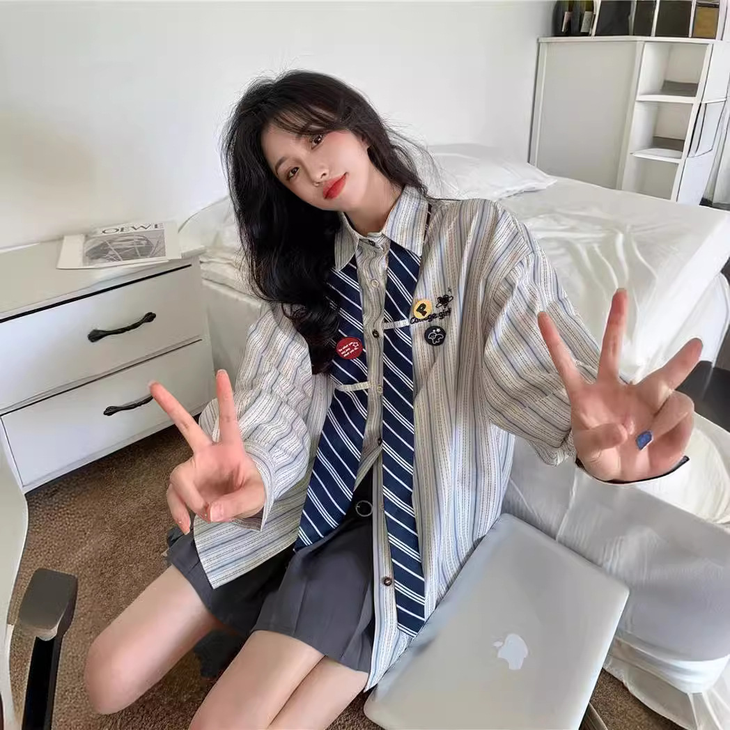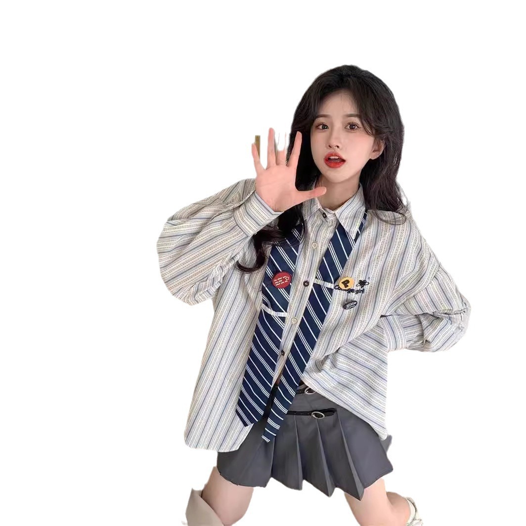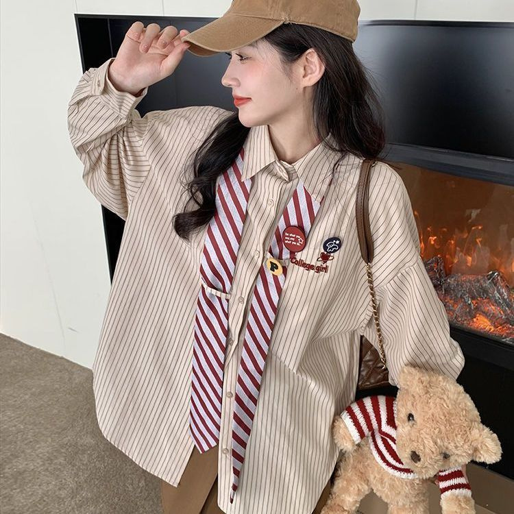 | nameOriginal | Spring striped shirt preppy style loose vintage American design slim fit sweet cute tie long sleeve top |