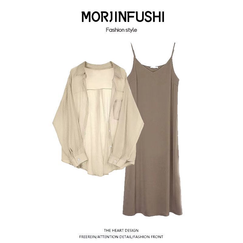 Spring suit Women's 2024 New Fashion plus size Wear Sunscreen Chiffon Shirt with Sling dress Two-piece Set