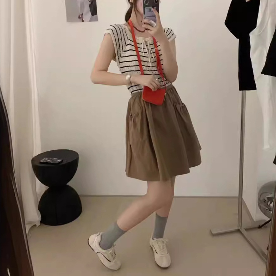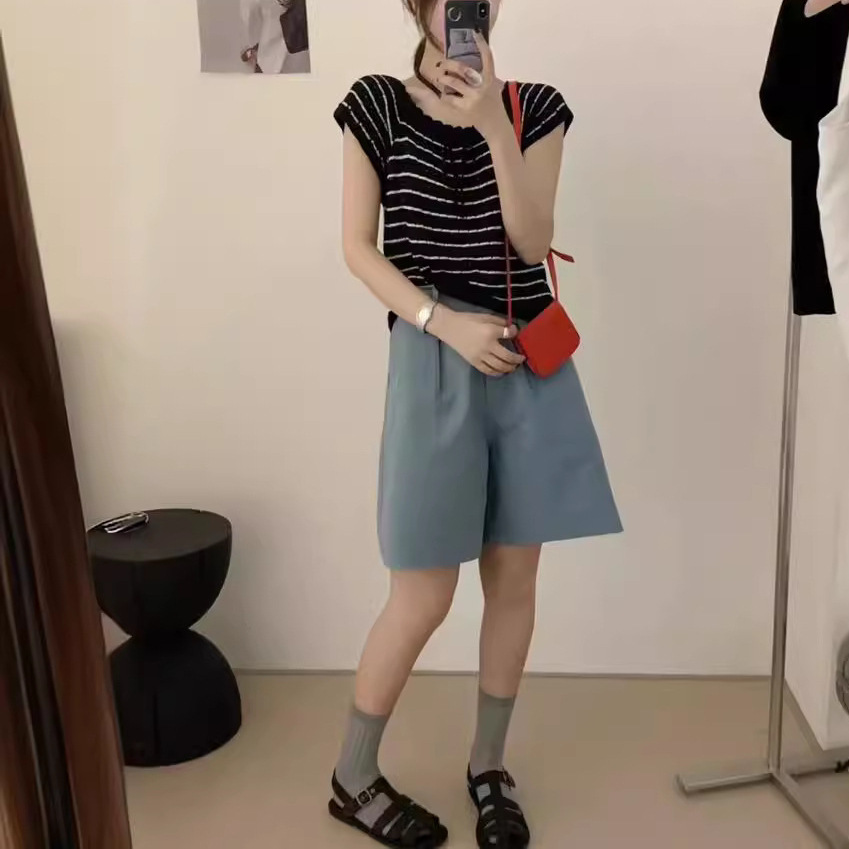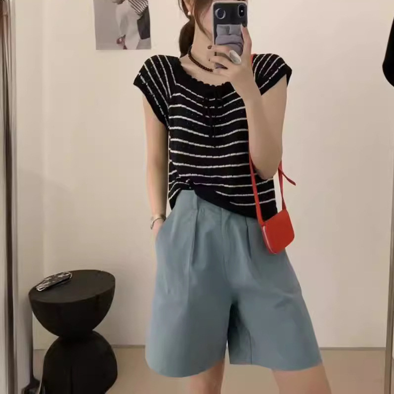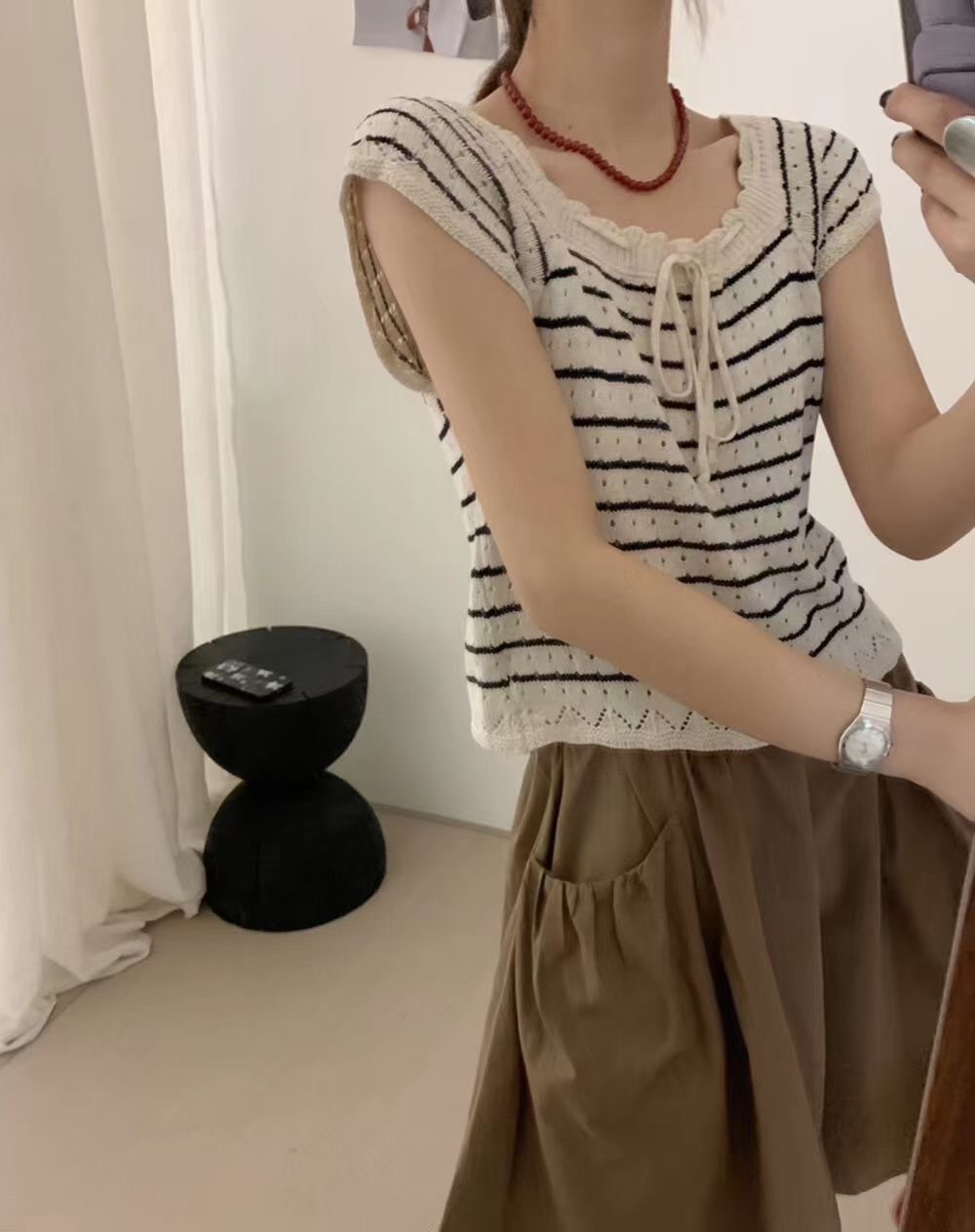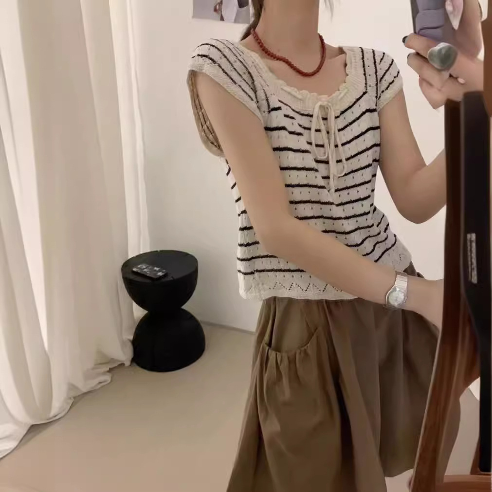 Square Collar Hollow Striped Short-sleeved Sweater Women’s Summer Thin 2024 New Design Sense Niche Lace-up Top Trendy