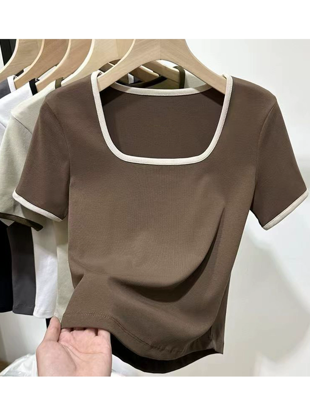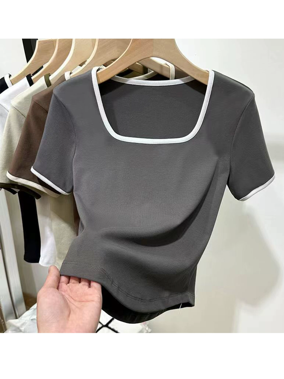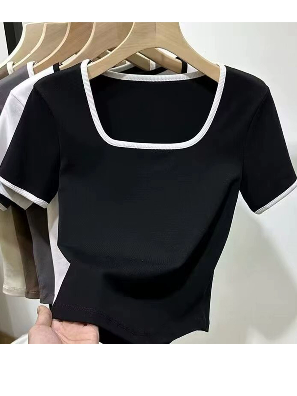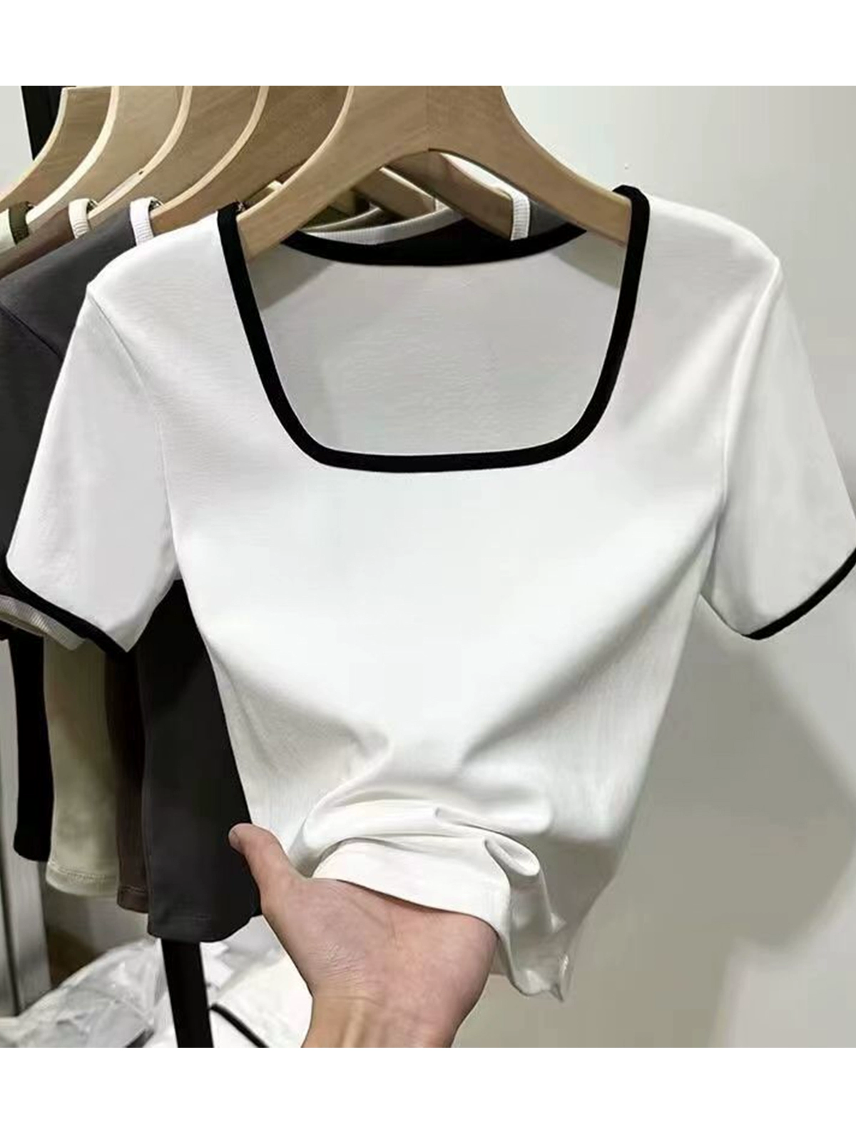 Square collar niche contrasting color slim fit top short-sleeved T-shirt