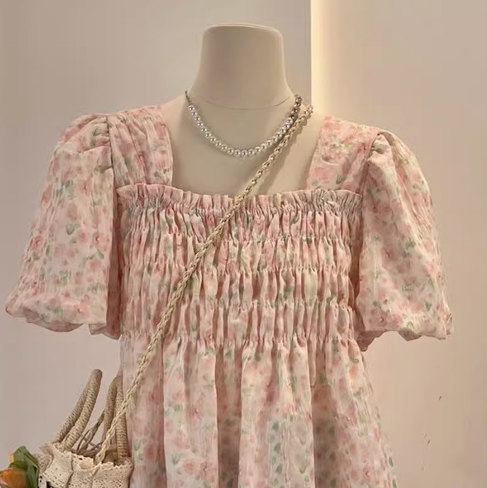 Square Collar Pink Floral Top Women's 2024 Summer Chiffon Shirt Puff Sleeve Elegant Slim Shirt Western Style Small Shirt