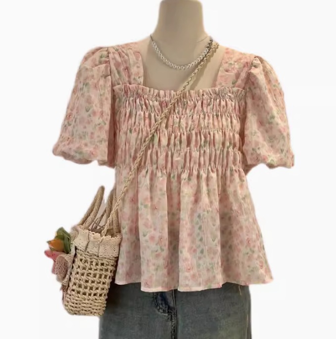 Square Collar Pink Floral Top Women’s 2024 Summer Chiffon Shirt Puff Sleeve Elegant Slim Shirt Western Style Small Shirt