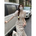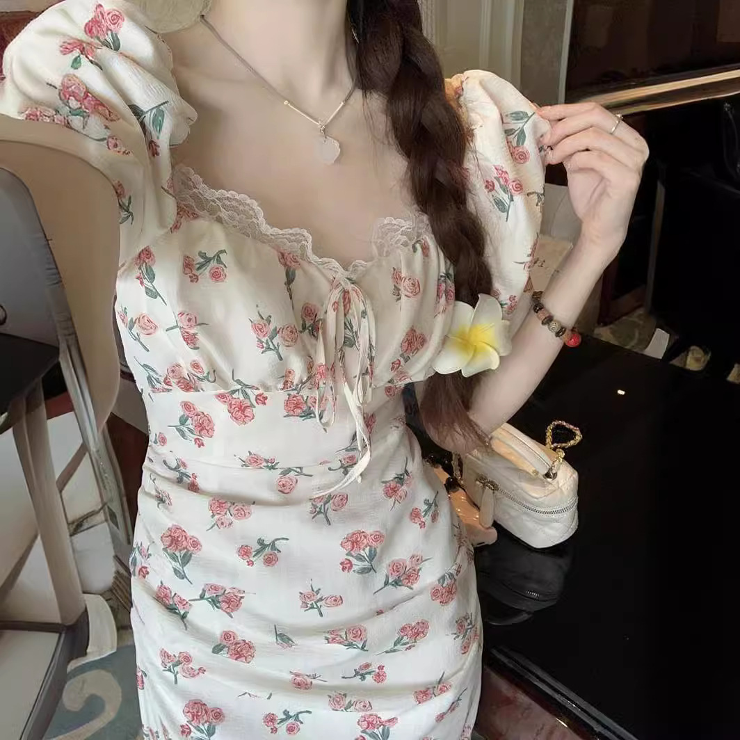 | nameOriginal | Square Collar Puff Sleeve Floral Dress Summer Women's French Style Gentle High-end Lace-up Waisted Slimming Tea Break Dress |