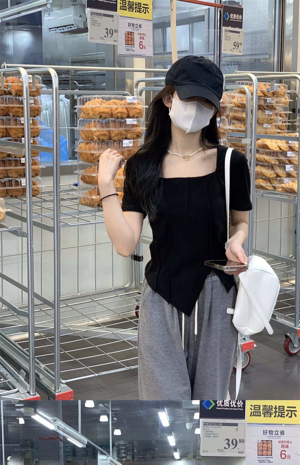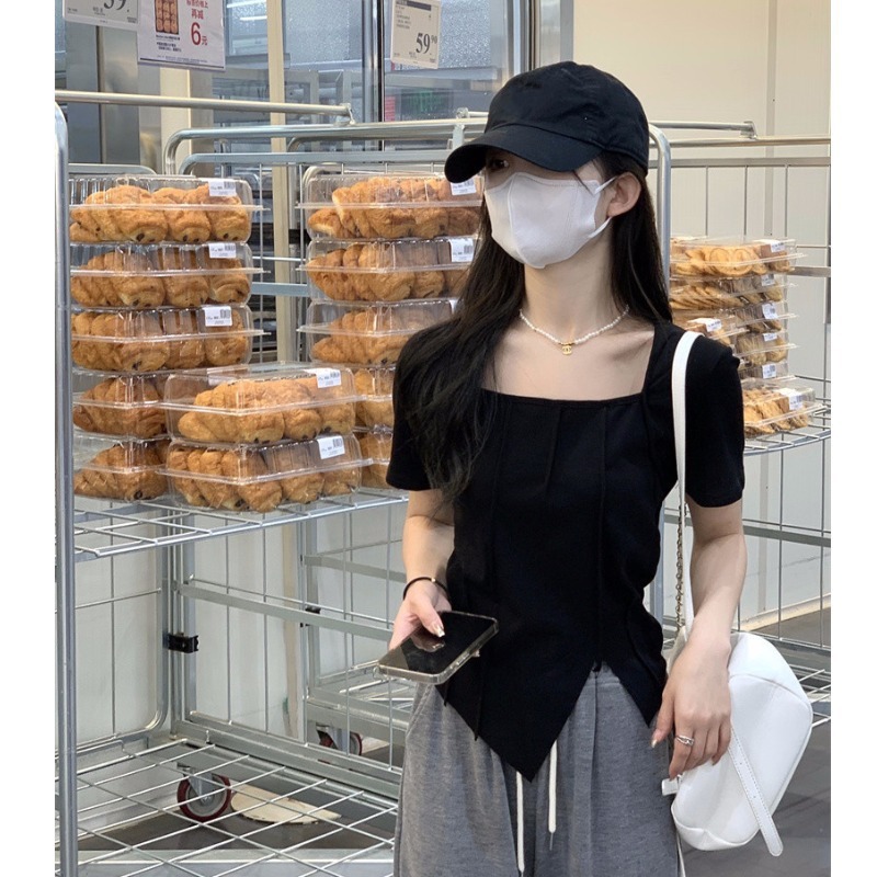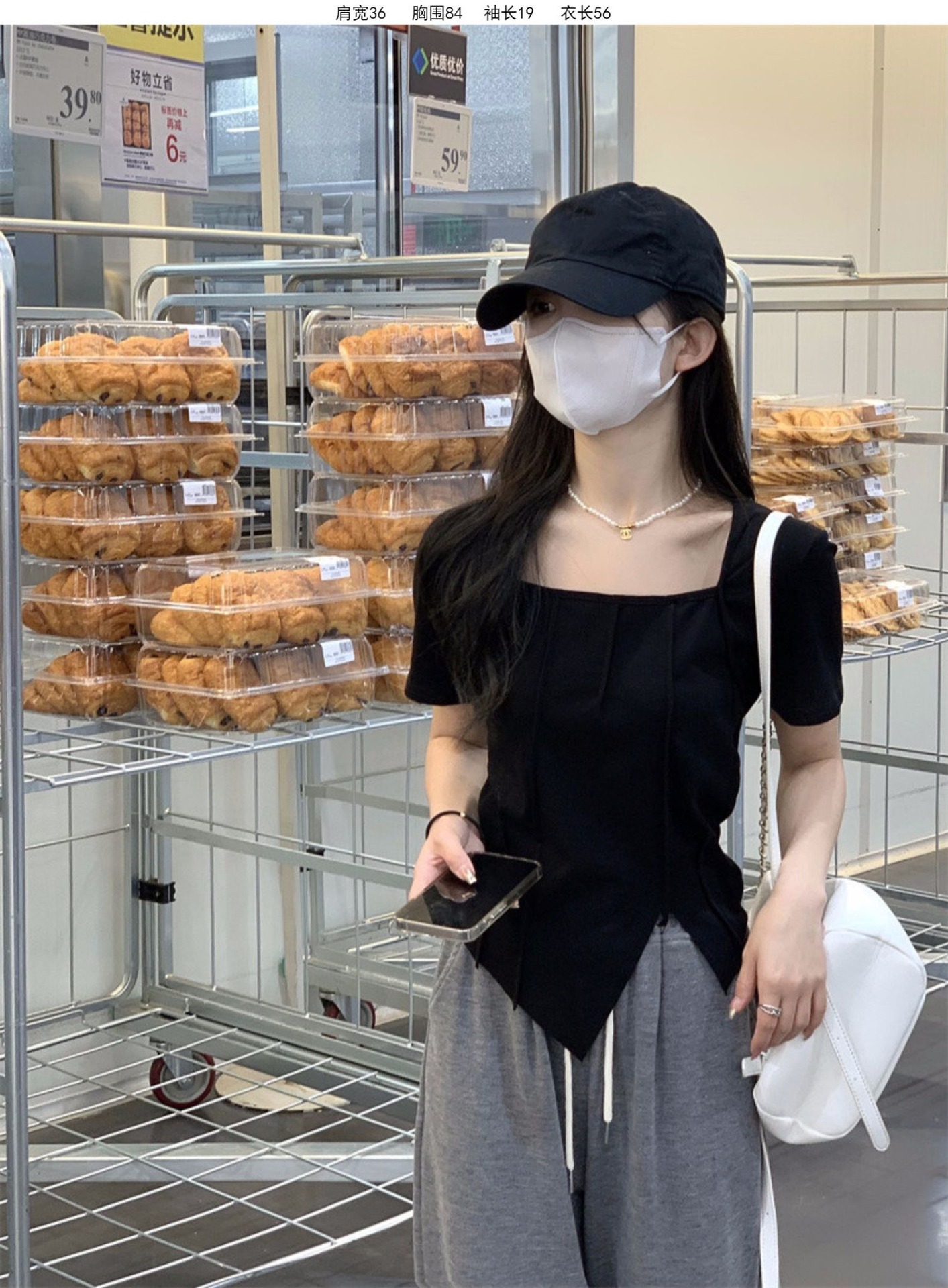 Square Collar Short Top Women's Design Sense Niche 2024 Summer New Irregular Slimming Shoulder Short Sleeve Tide T-shirt