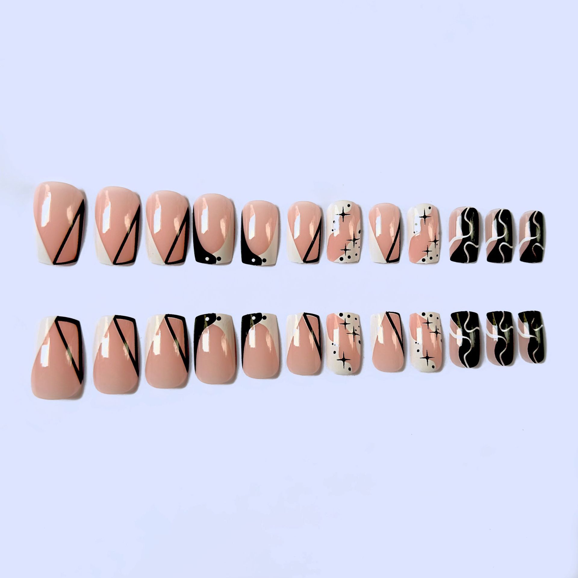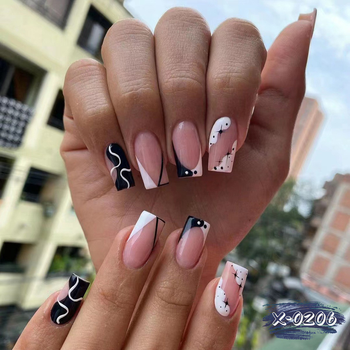| nameOriginal | Square head-shaped black and white lines false nails black cool manicure 24 pieces finished products direct wholesale |