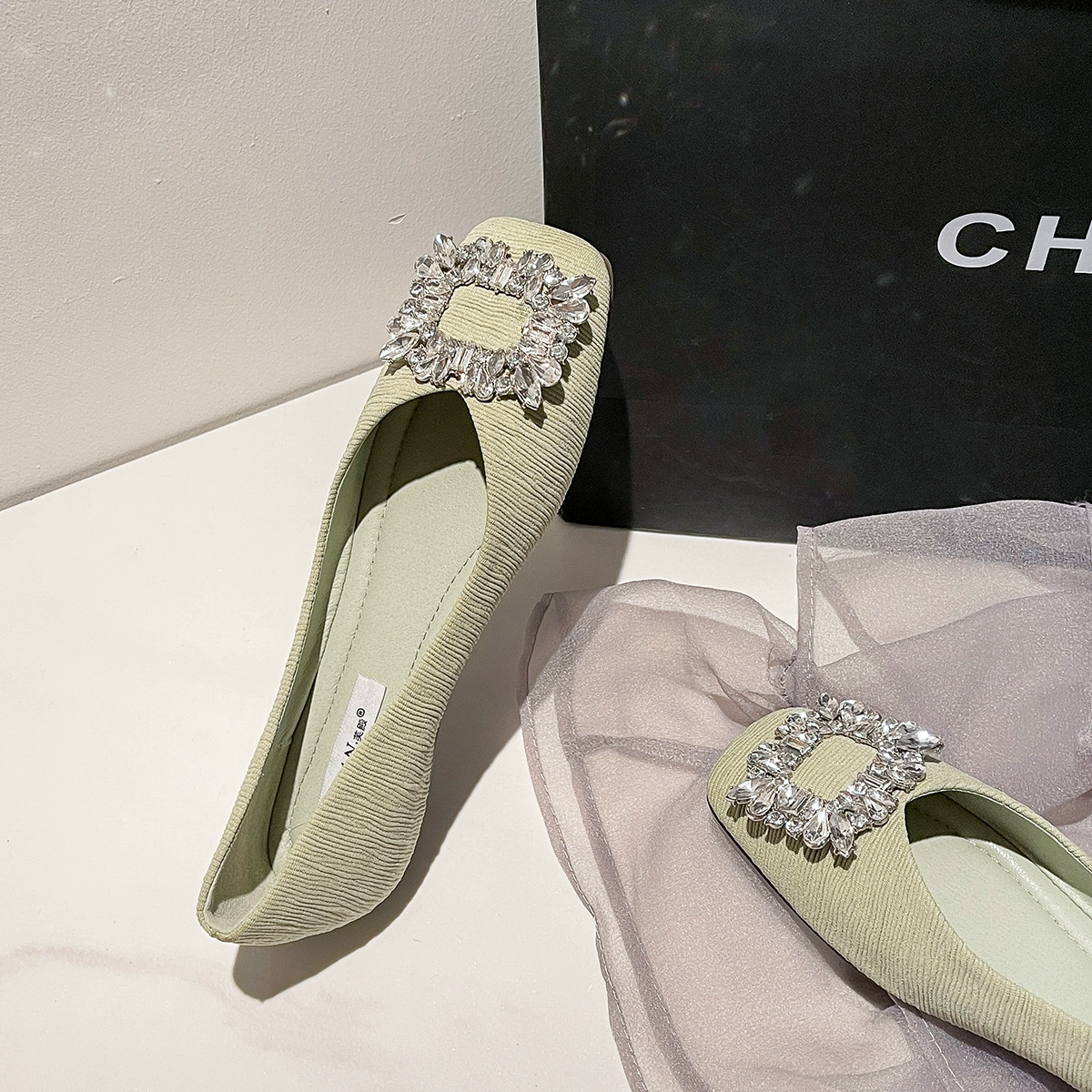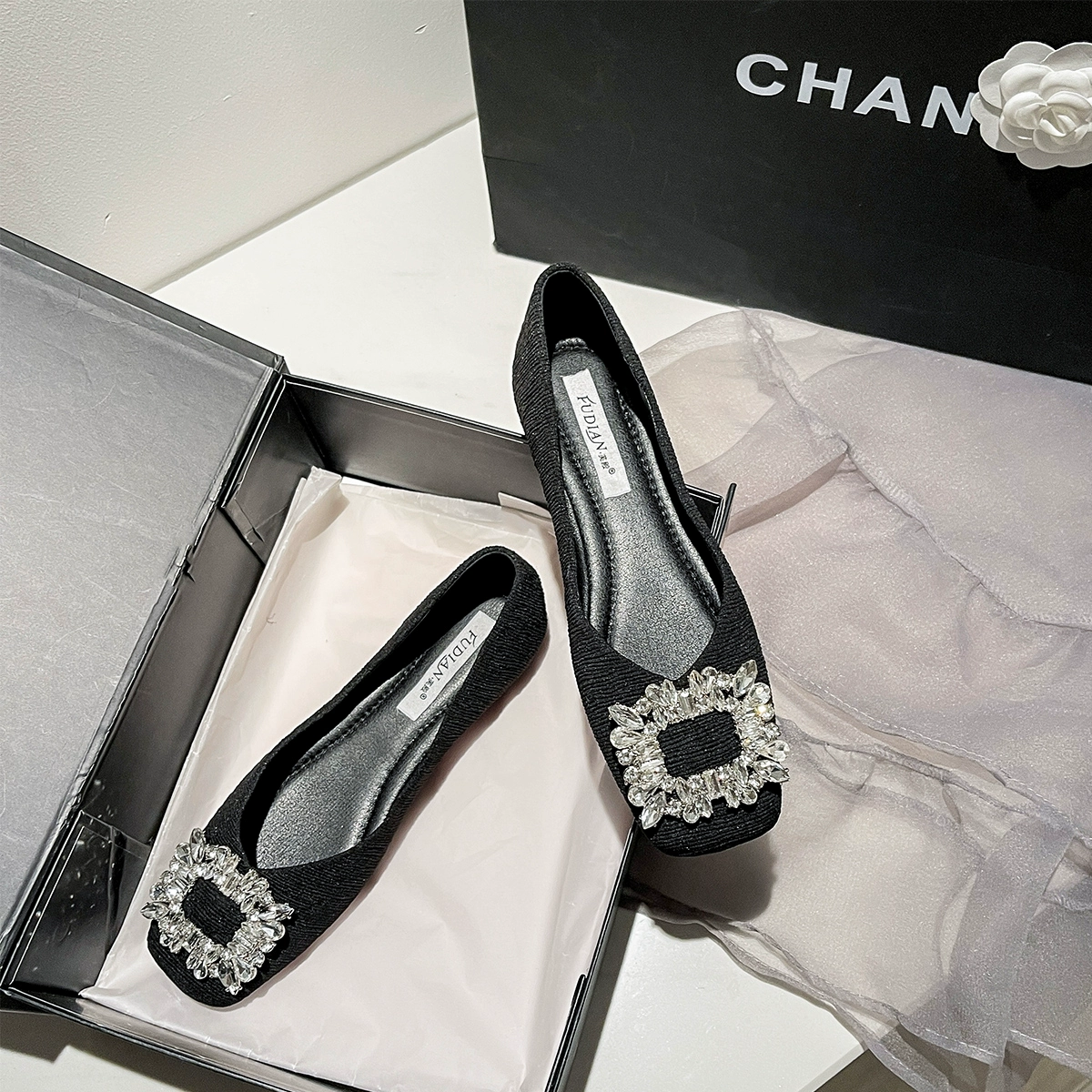 | nameOriginal | Square toe autumn and winter French style rhinestone black shoes |