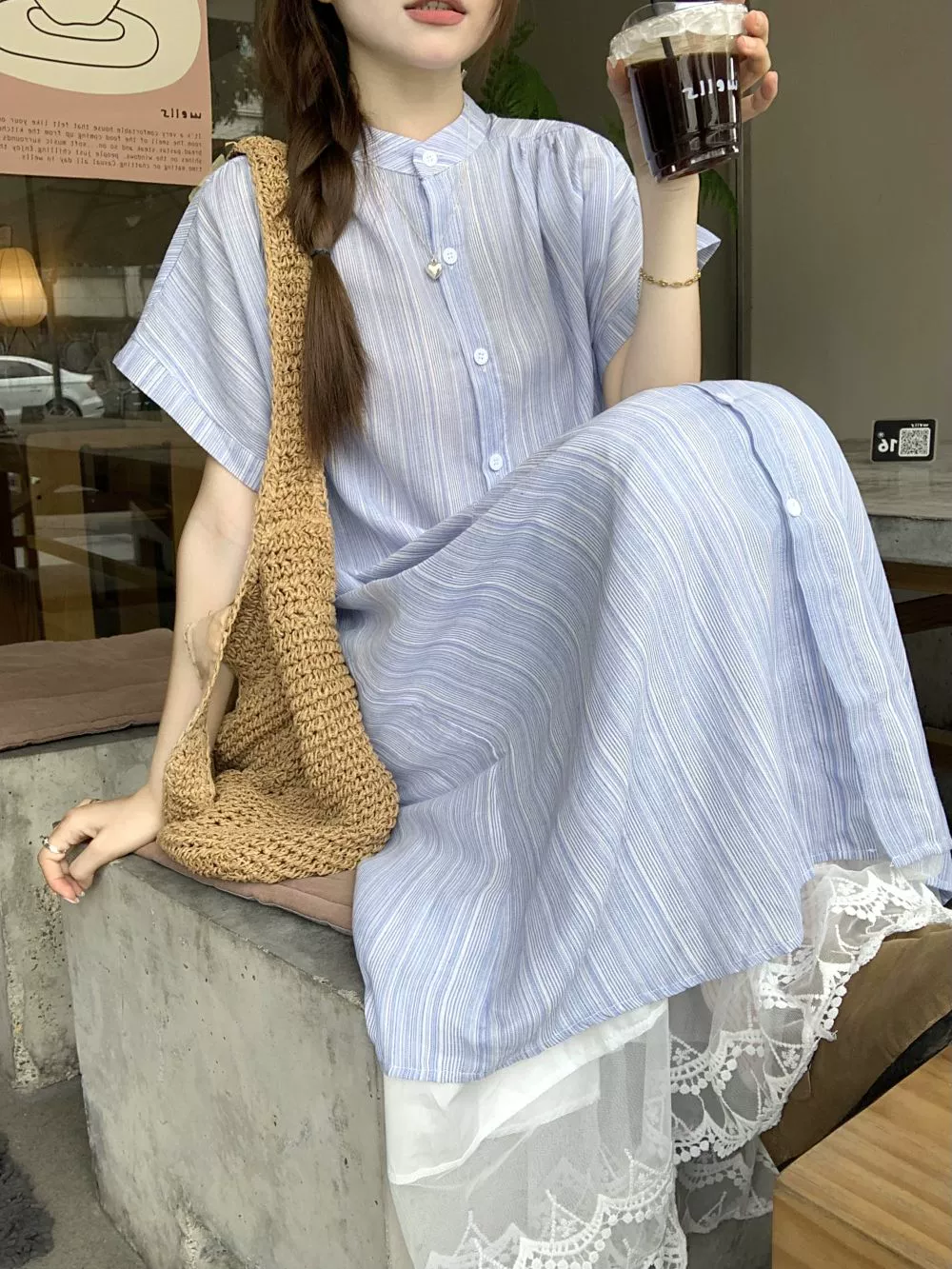 | nameOriginal | Stacking women's summer lace splicing two-piece striped shirt |
