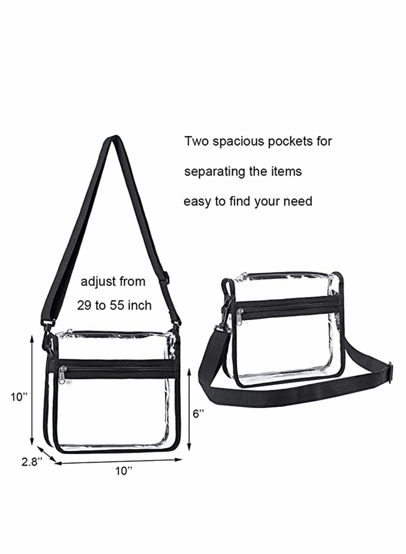 This clear cross-body bag is perfect for workplaces and events that require transparent bags. It meets tournament guidelines and has passed through security with ease. Made of heavy-duty transparent PVC materials, this high-quality stadium purse has a zipper closure and a convenient front pocket. With a size of 10 x 10 x 2.8 inches, it can hold all your essentials such as suntan lotion, wallet, keys, cell phone, sunglasses, card, cash, and more. The adjustable cross-body strap can be used as a shoulder or crossbody purse, making it suitable for both women and men. The completely see-through design saves time and provides convenience, allowing you to easily get through security lines without wasting time picking out your belongings.