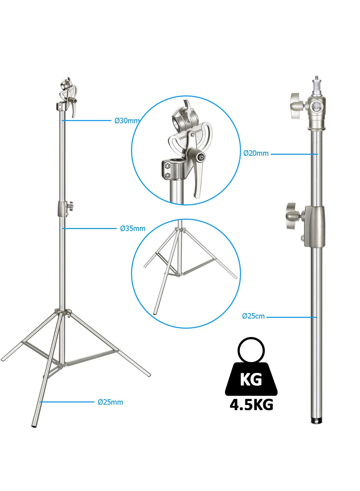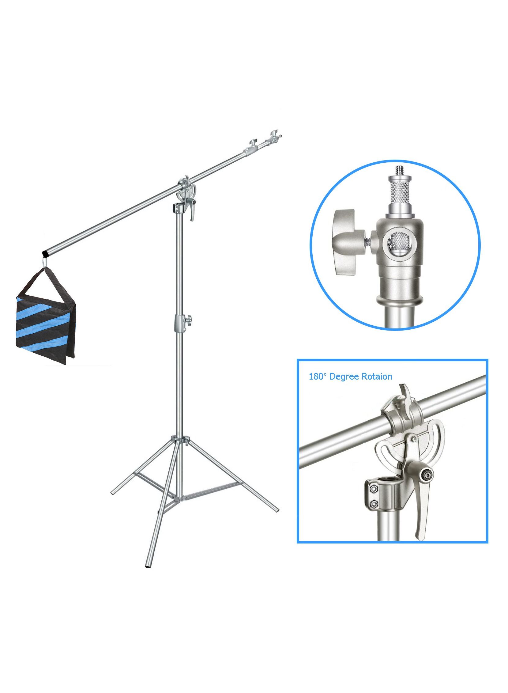 Stainless steel photo studio light stand with adjustable boom arm and sandbag support. Max height of 12.63 feet. Ideal for portrait and video lighting.