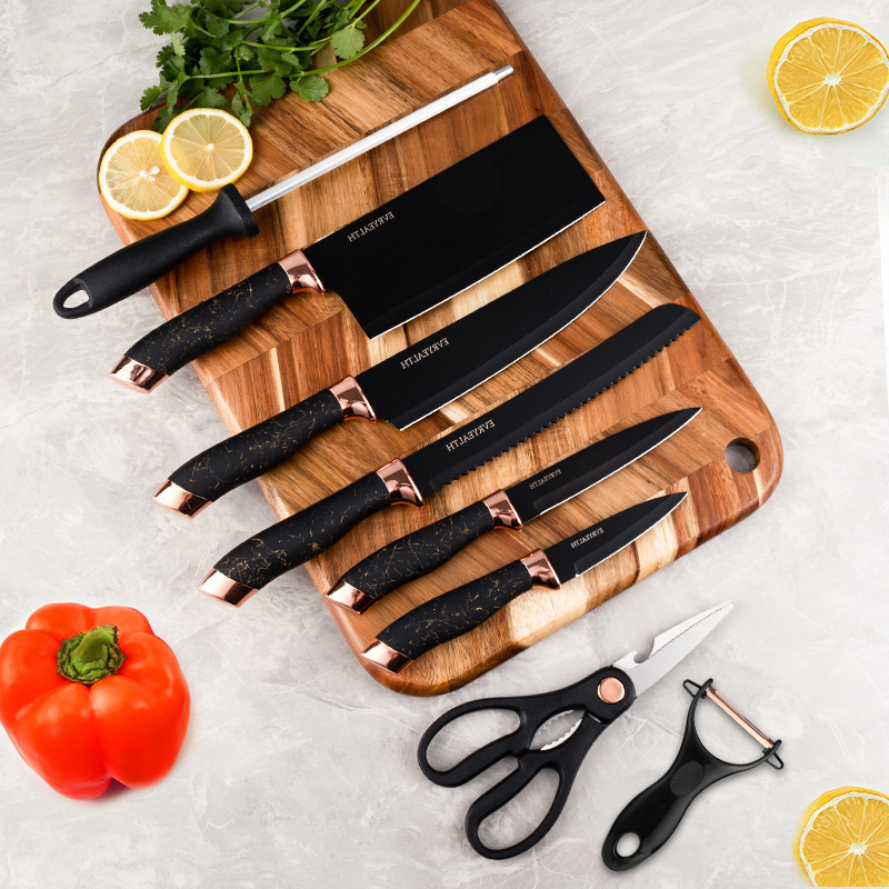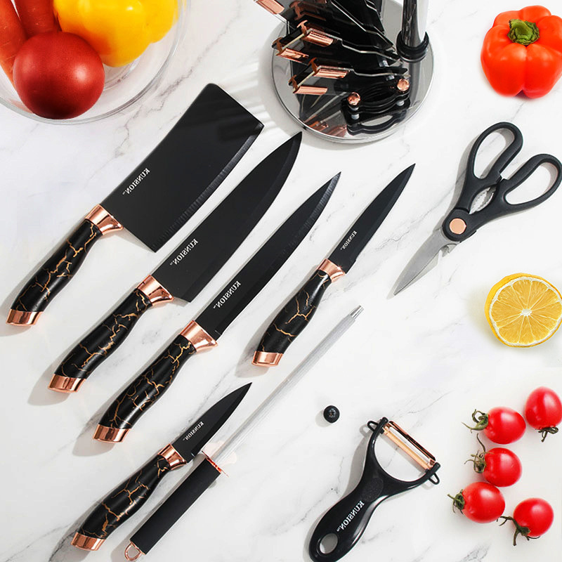| nameOriginal | Stainless steel rotating seat kitchen knife suit nine-piece set double plating head with knife holder marble grain handle set knife |