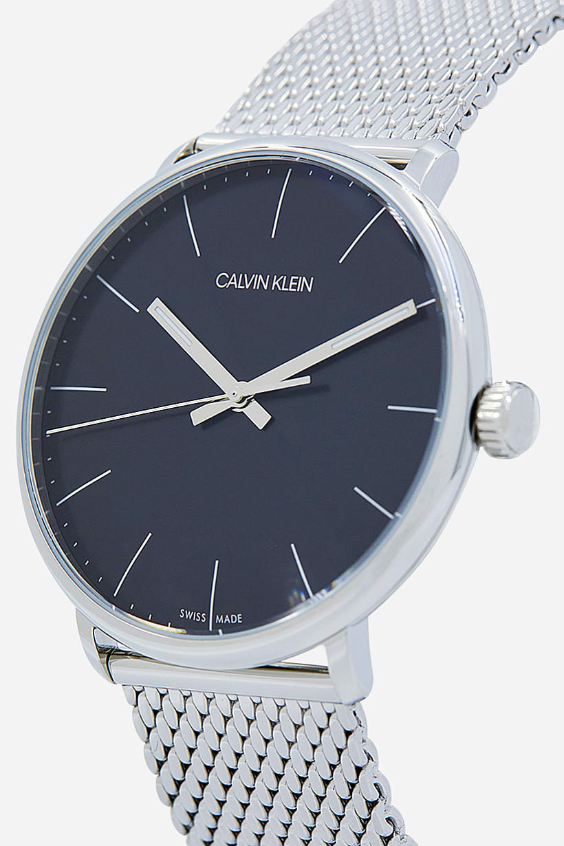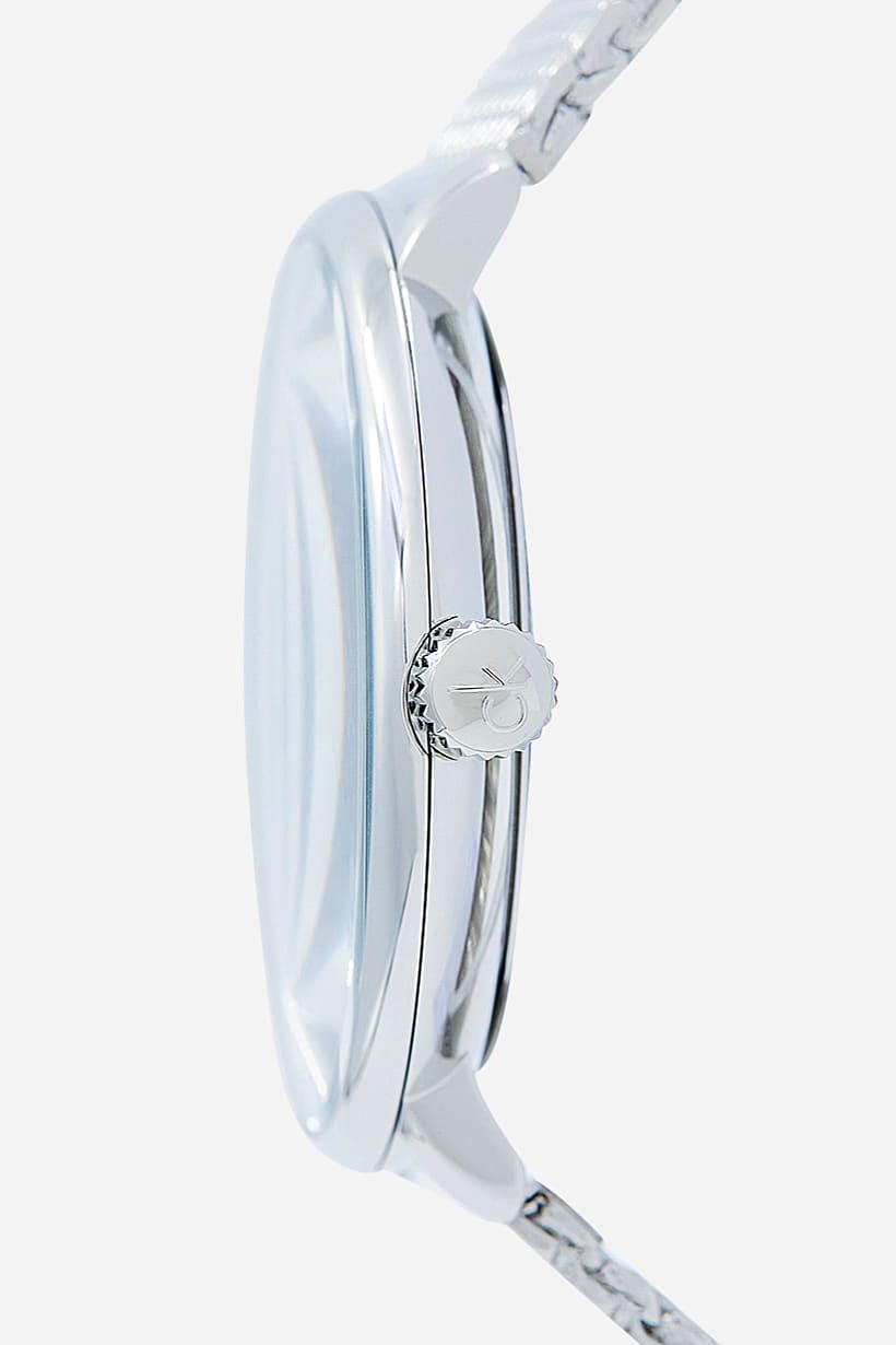 This watch features a round dial with a glass window and marker display. It is an ideal gift for women and has a sleek silver strap made of stainless steel. The watch is analog and has a deployment clasp for easy closure. The dial color is also silver, making it a perfect addition to any silver-themed outfit.