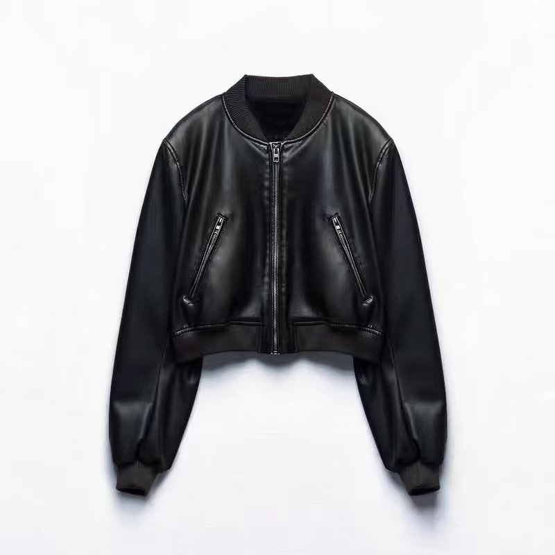 | nameOriginal | stand collar 2023 street fashion european and american style women's imitation leather short leather coat spring black bomber jacket |