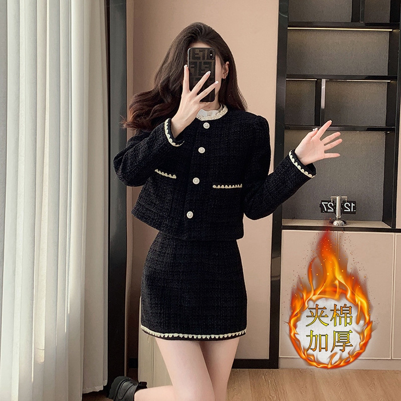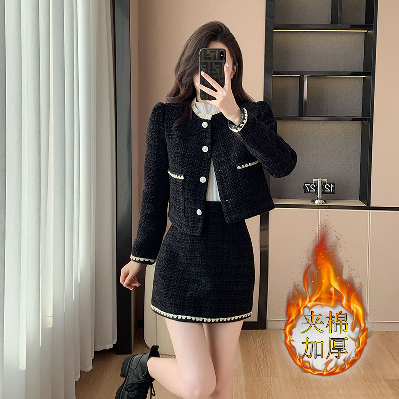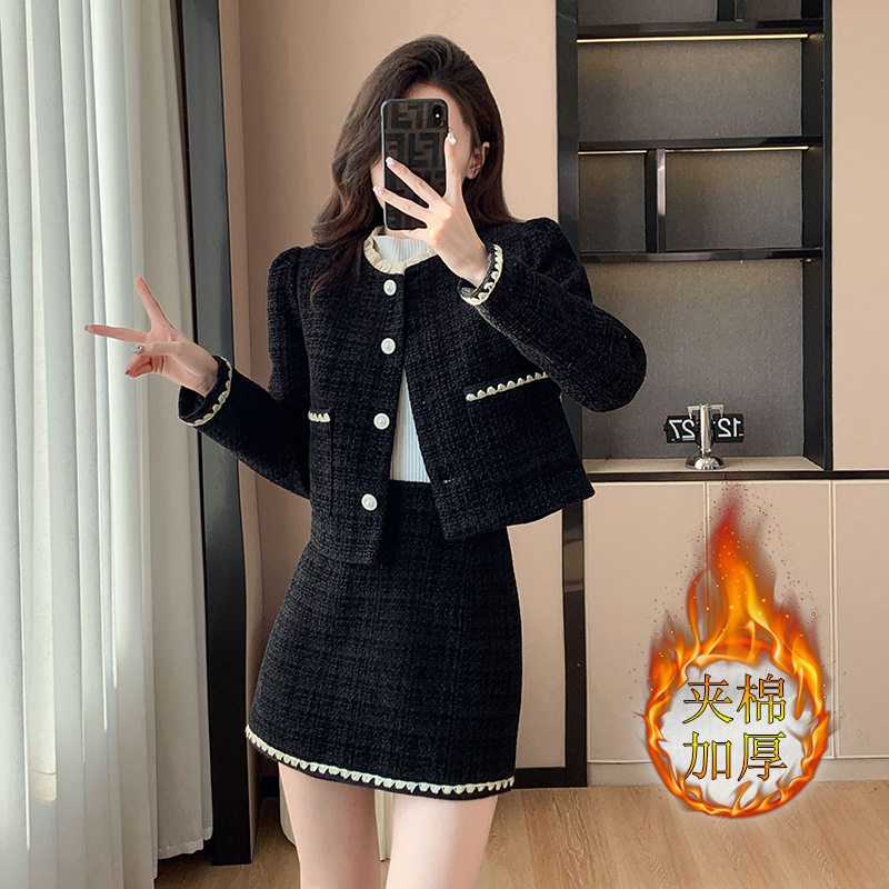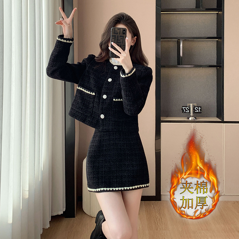 | nameOriginal | Stand Collar Coat Chanel style suit women's winter New Western style thickened coat high waist A- line skirt two-piece set |
