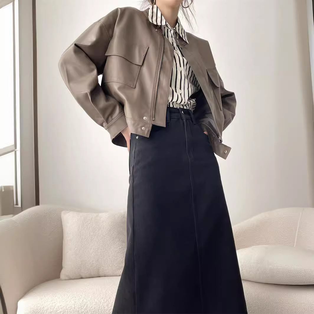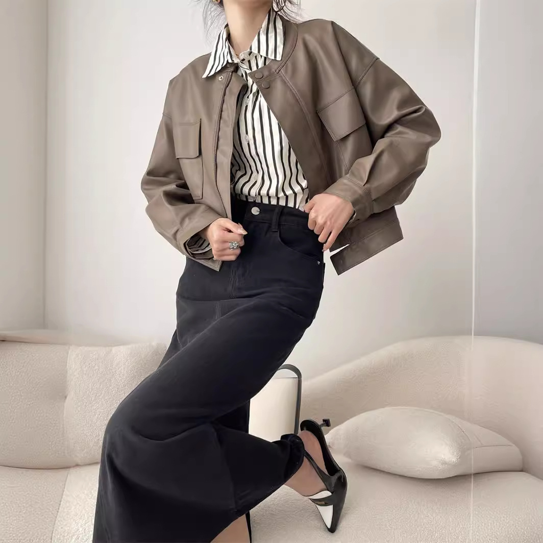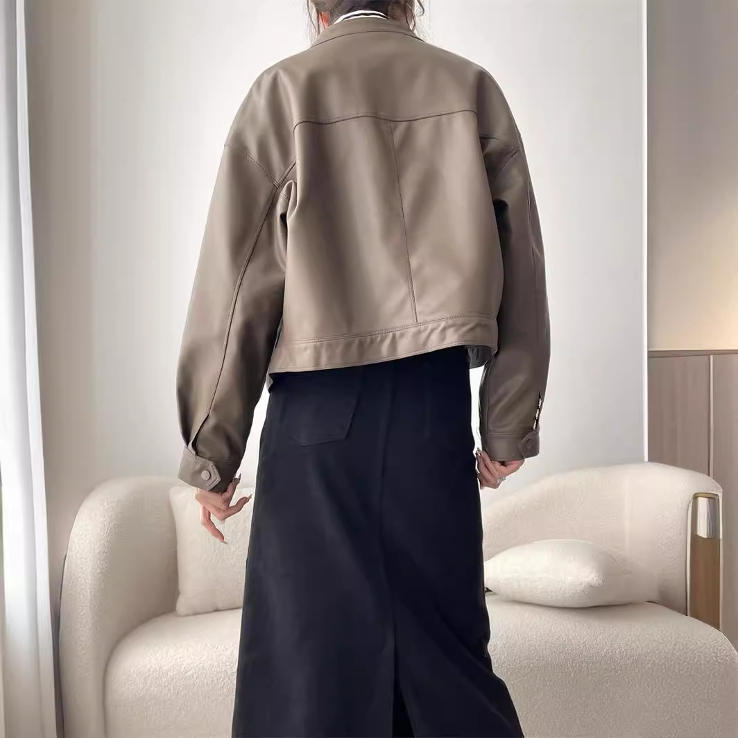 Stand Collar double pocket leather coat X1904