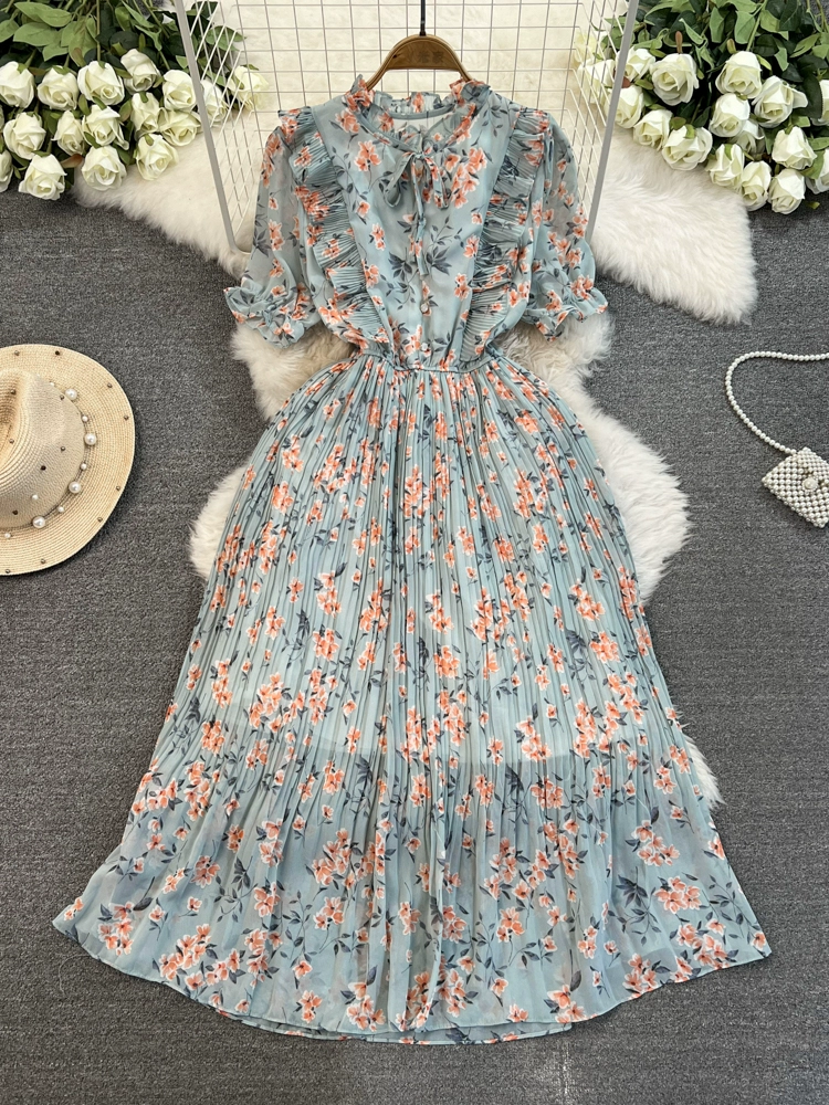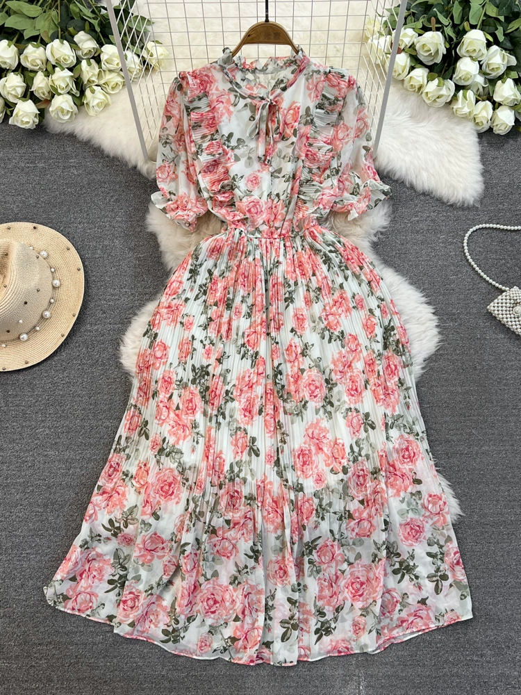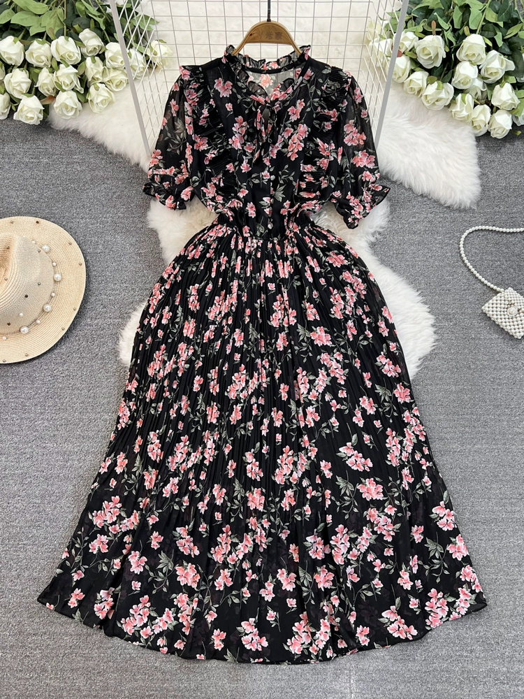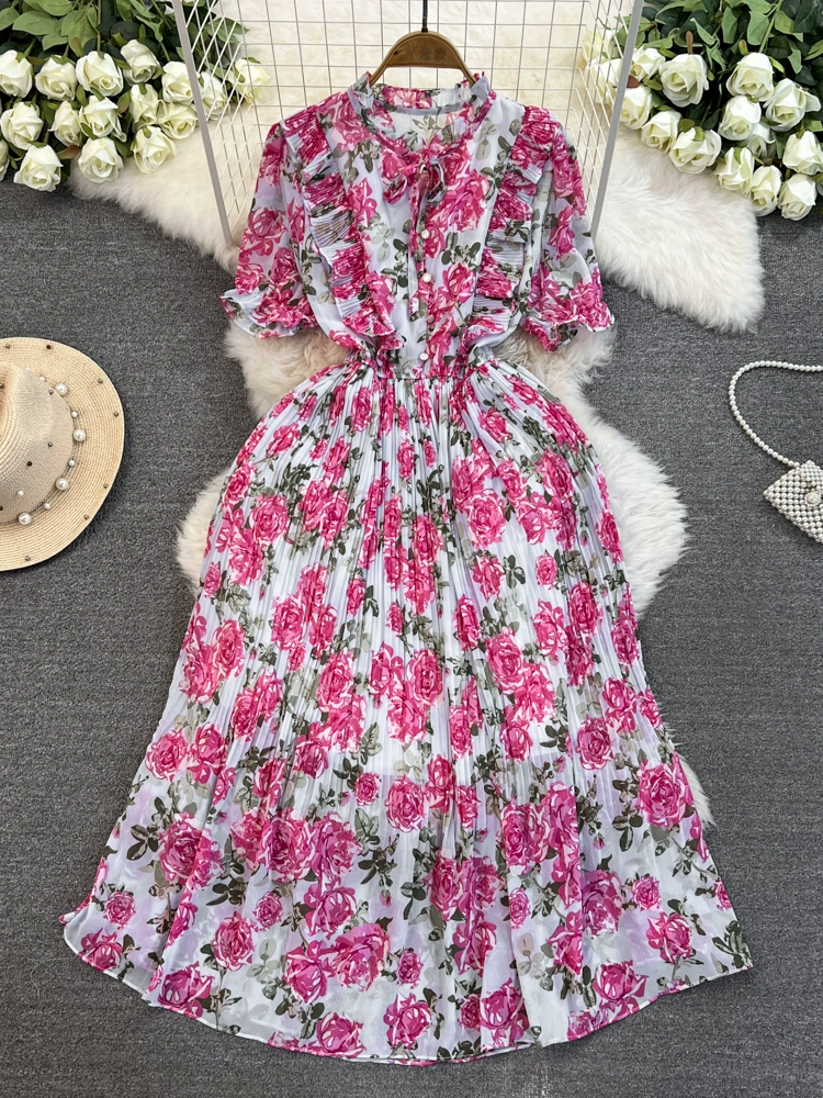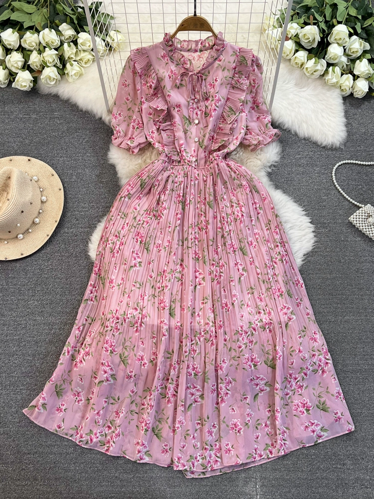 Stand collar floral chiffon dress new summer style slim waist slimming Platycodon French retro fairy dress with big swing