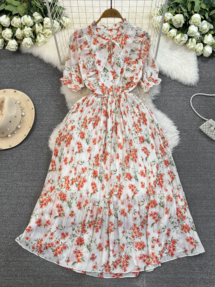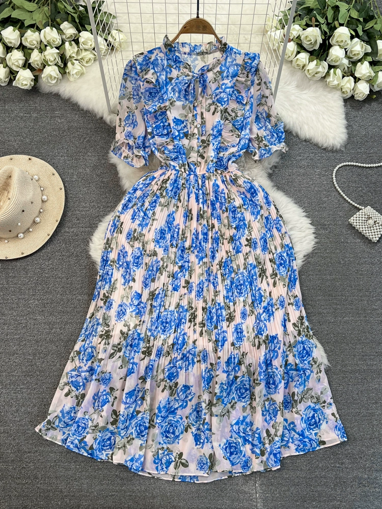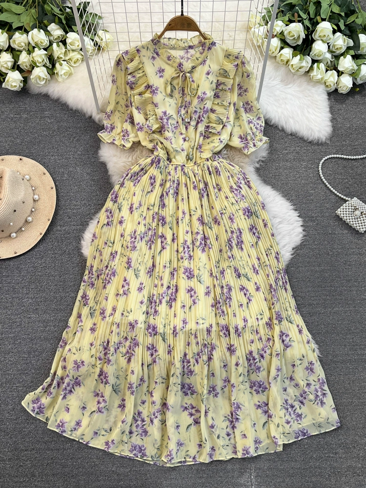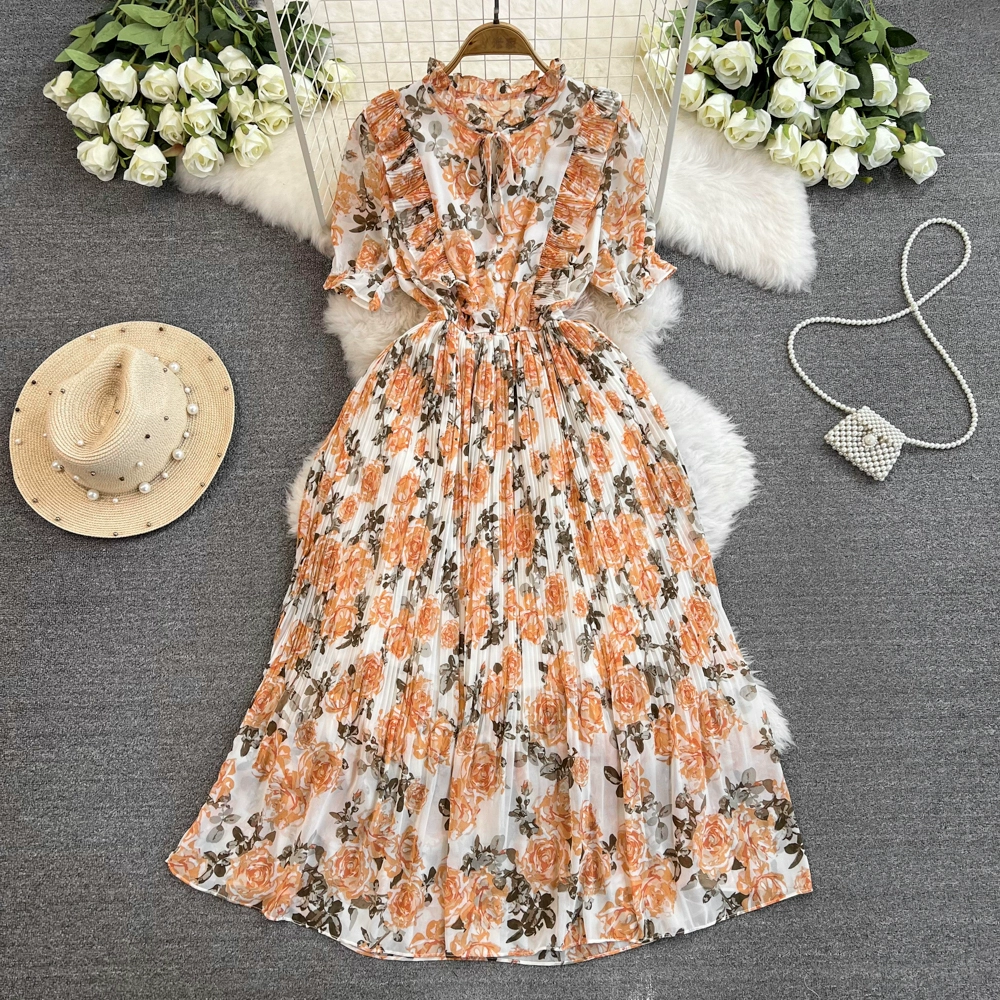 Stand collar floral chiffon dress new summer style slim waist slimming Platycodon French retro fairy dress with big swing