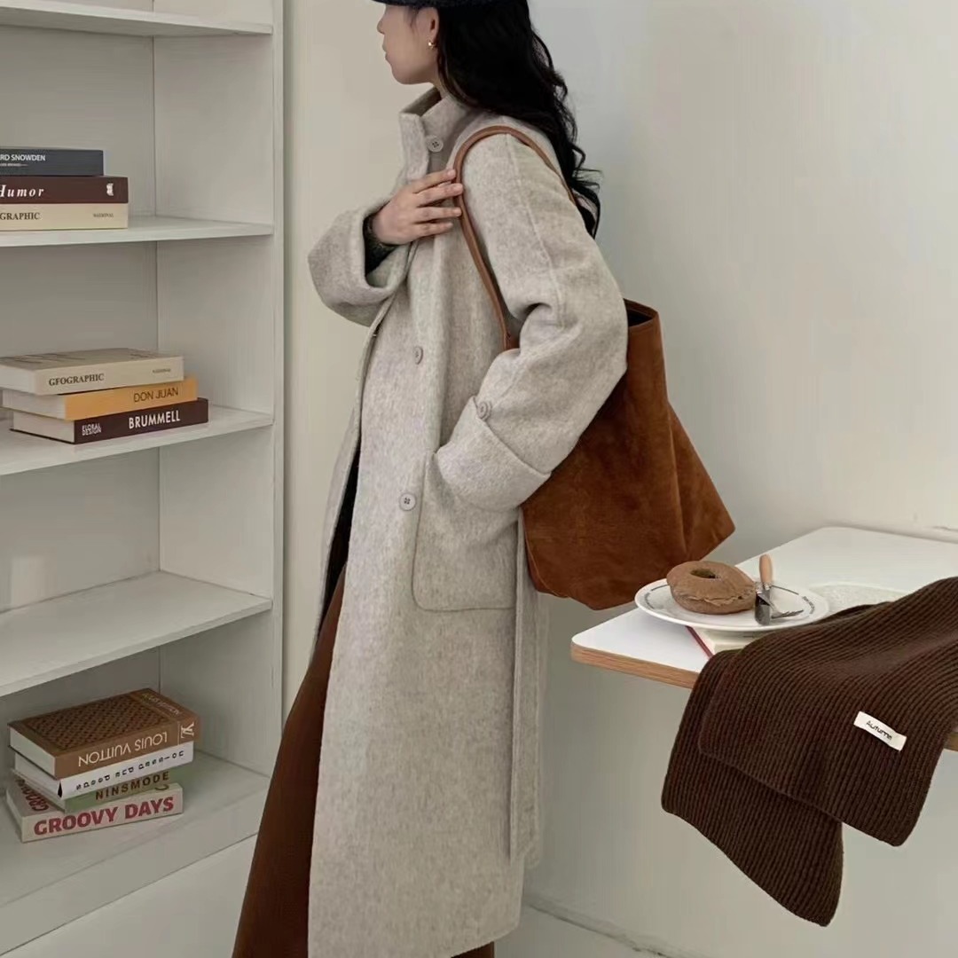 Stand Collar large sleeve double-sided wool coat belt large pocket loose Maillard cashmere double-sided coat for women