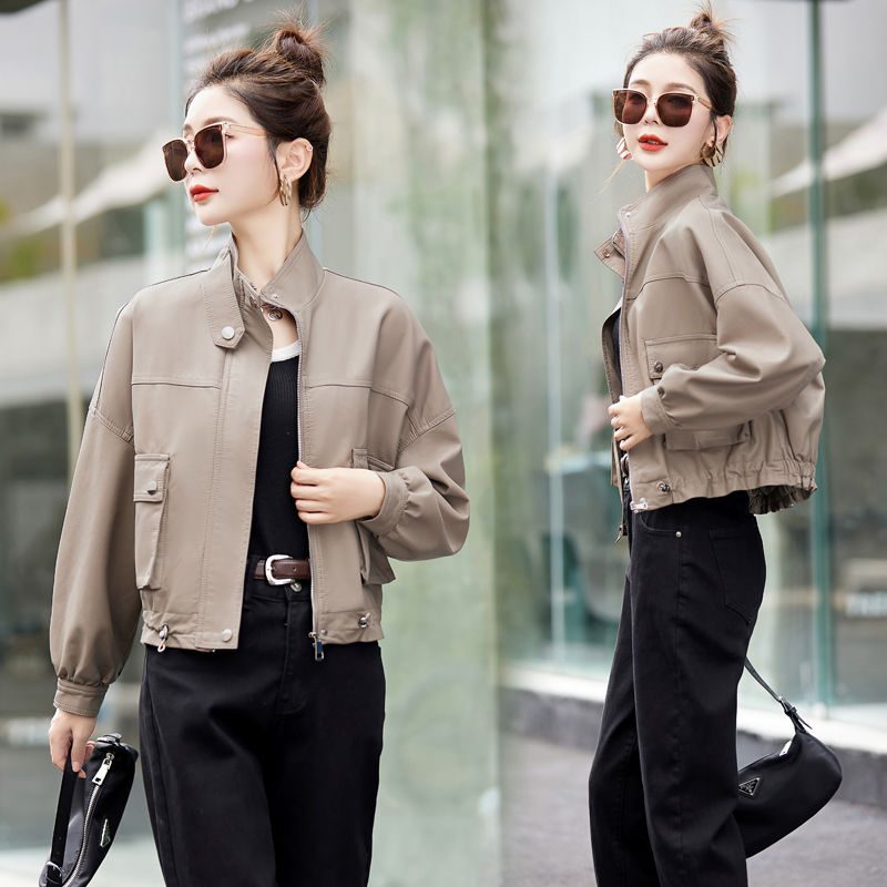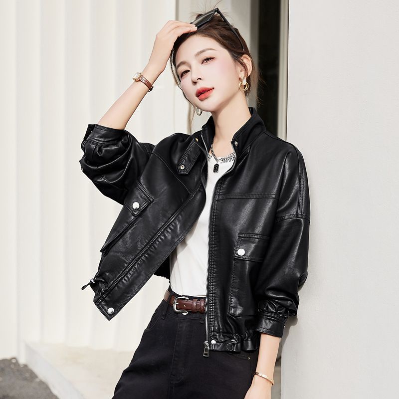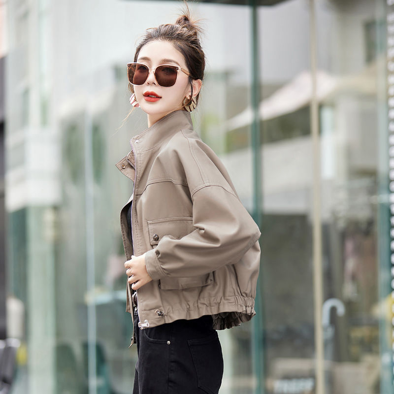 Stand collar leather coat for women 2023 autumn new high-end fashion loose slimming short fashionable soft leather pu jacket