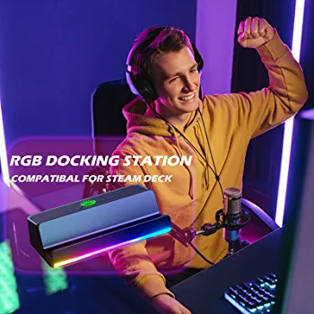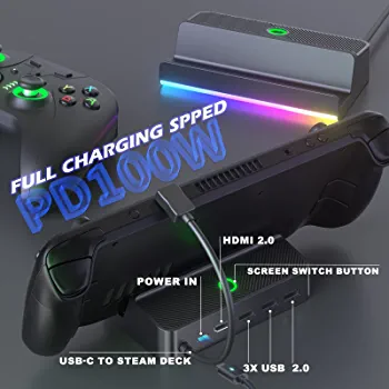 Steam Deck Docking Station with 4K@60Hz HDMI 2.0, 3 USB 2.0 ports, 100W charging speed, RGB light, and screen switch function. Compatible with Steam Deck.