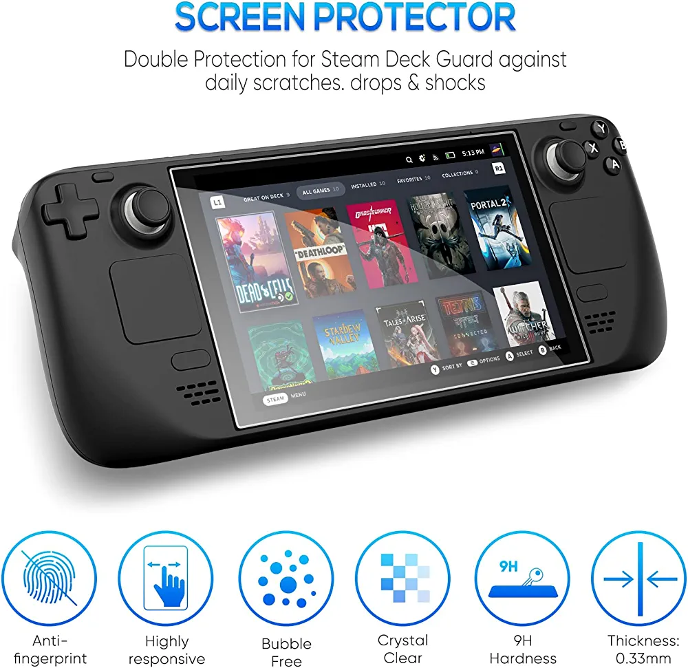 This set of accessories for the Steam Deck includes a case and screen protector, as well as a flexible and durable kickstand. The case features a built-in zinc alloy adjustable kickstand on the back, which provides stability and has powerful magnetic absorption to prevent it from falling off. The kickstand supports multiple angles for personalized comfort while playing and folds up for easy portability.