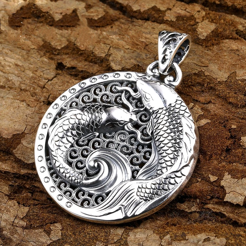 Sterling silver like a fish in water to attract wealth and transport koi pendant for men and women couple necklace retro style national trend pendant double-sided