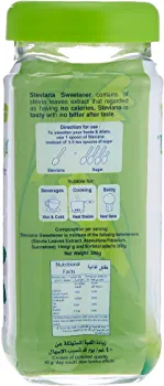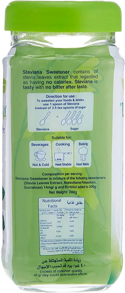 Steviana is sweetener that contain of stevia Rebaudiana which is an outstanding sweet tasting herb that has remarkable qualities ,contains zero calories.