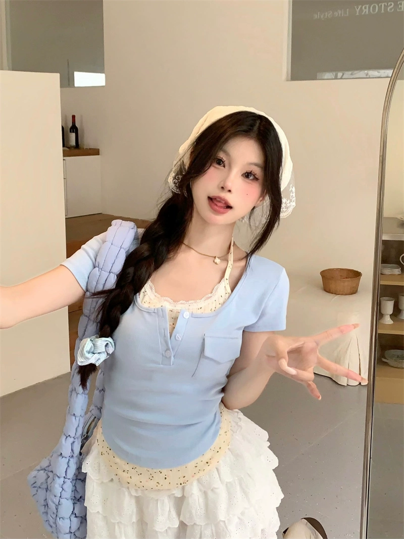 | nameOriginal | Stitched contrasting color T-shirt summer slim fit top fake two pieces |