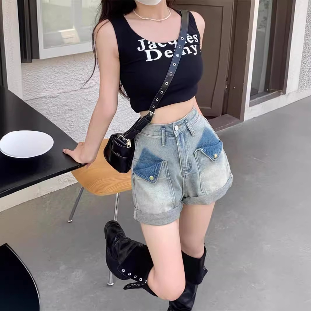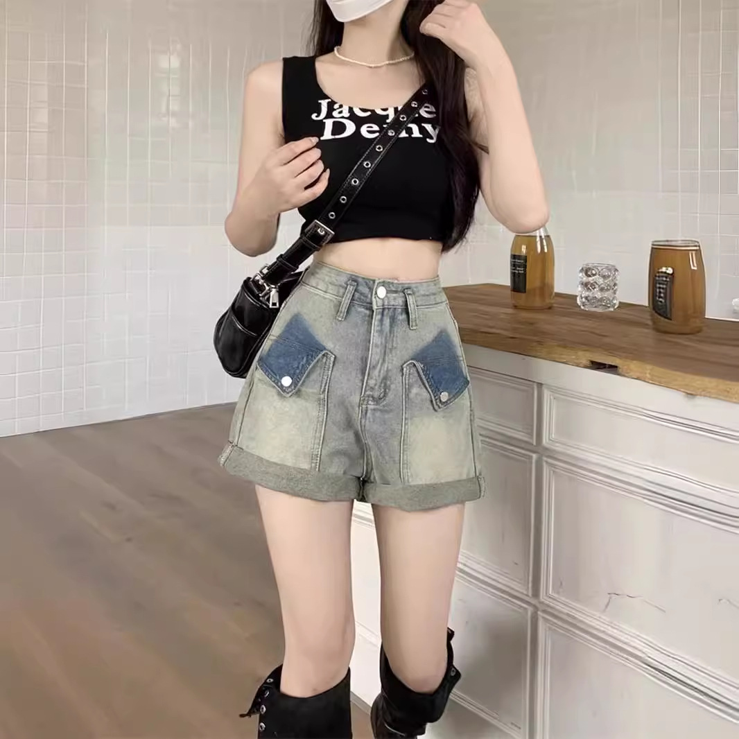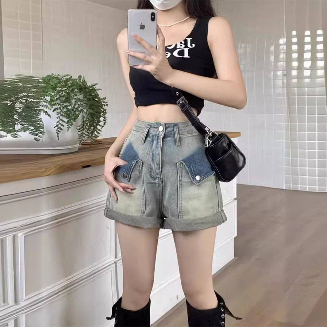 | nameOriginal | Straight Contrast Color Curl Denim Shorts Women's 2024 Summer New High Waist Loose All-match A- shaped Wide-leg Hot Pants |