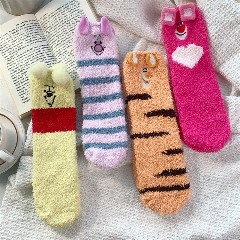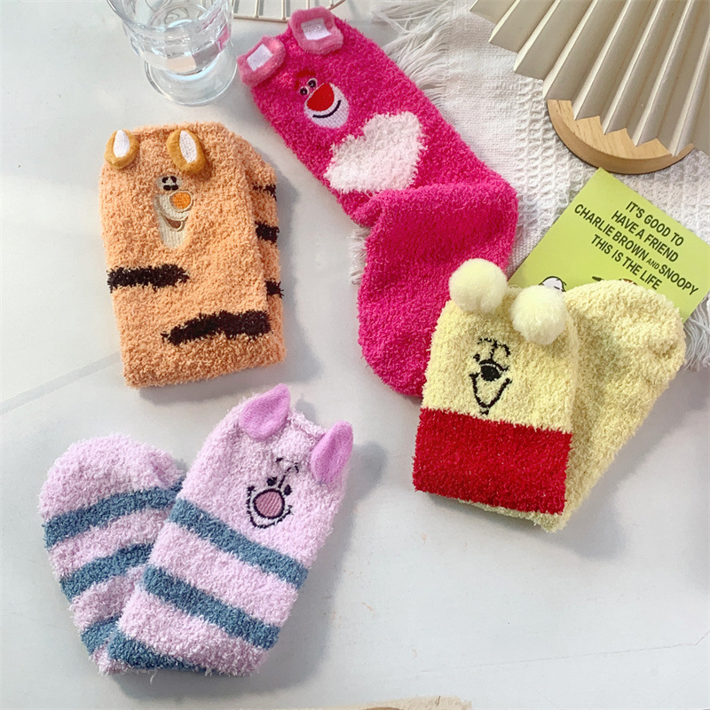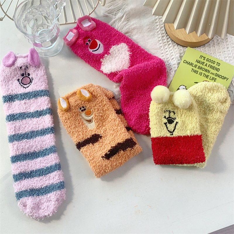 Strawberry bear pooh bear coral velvet socks women's autumn and winter fleece-lined warm girl's home floor socks breathable confinement socks