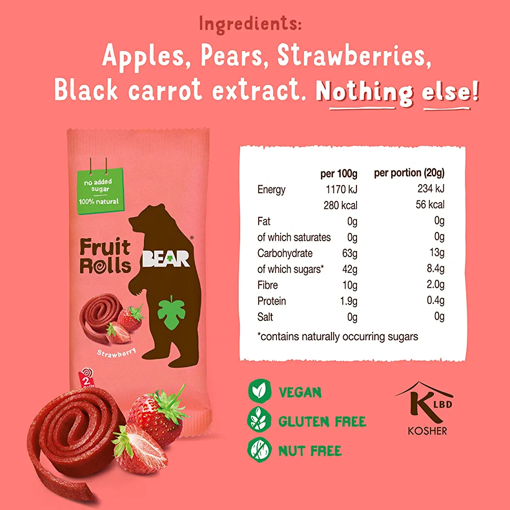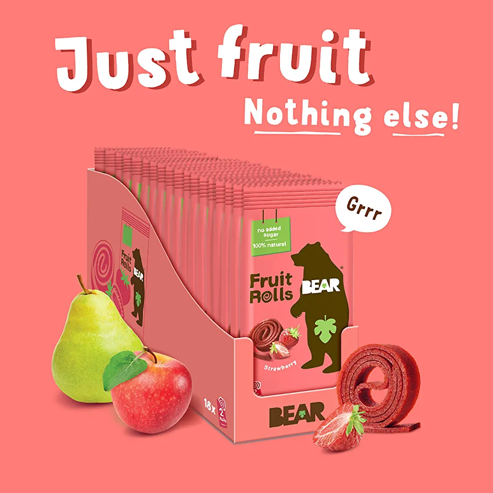| nameOriginal | BEAR ‘Fruit Rolls’ Strawberry – Natural Fruit Snack – No Added Sugar – Gluten Free Snack – Vegan Fruit Snack – Healthy On The Go Snack – 18 x 2 rolls – 360g |