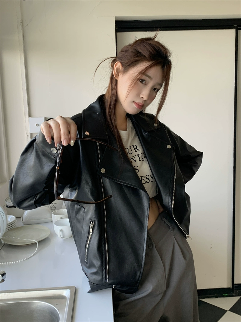 Street style lapel leather jacket women’s loose motorcycle