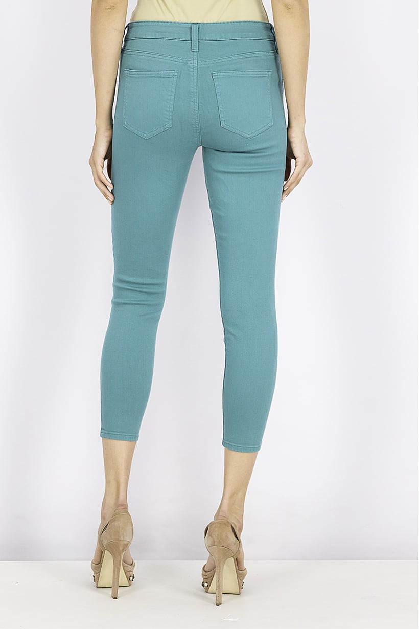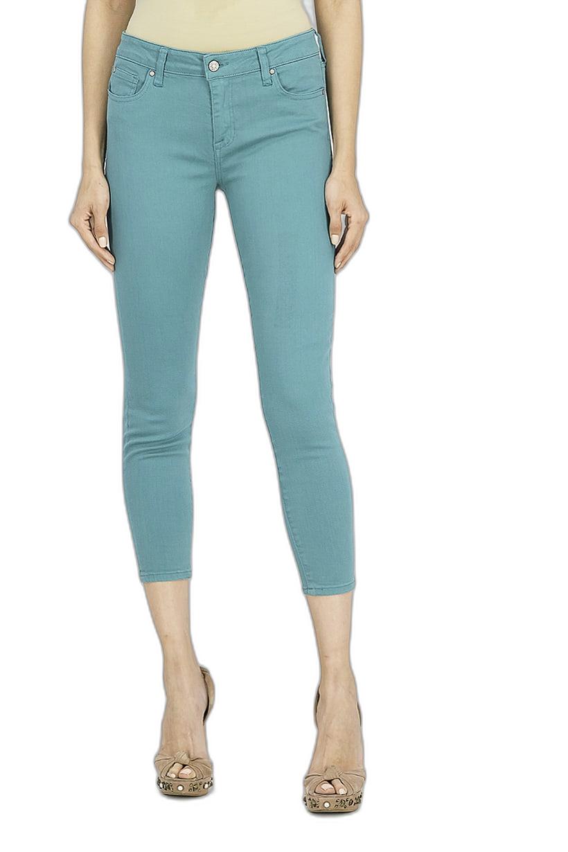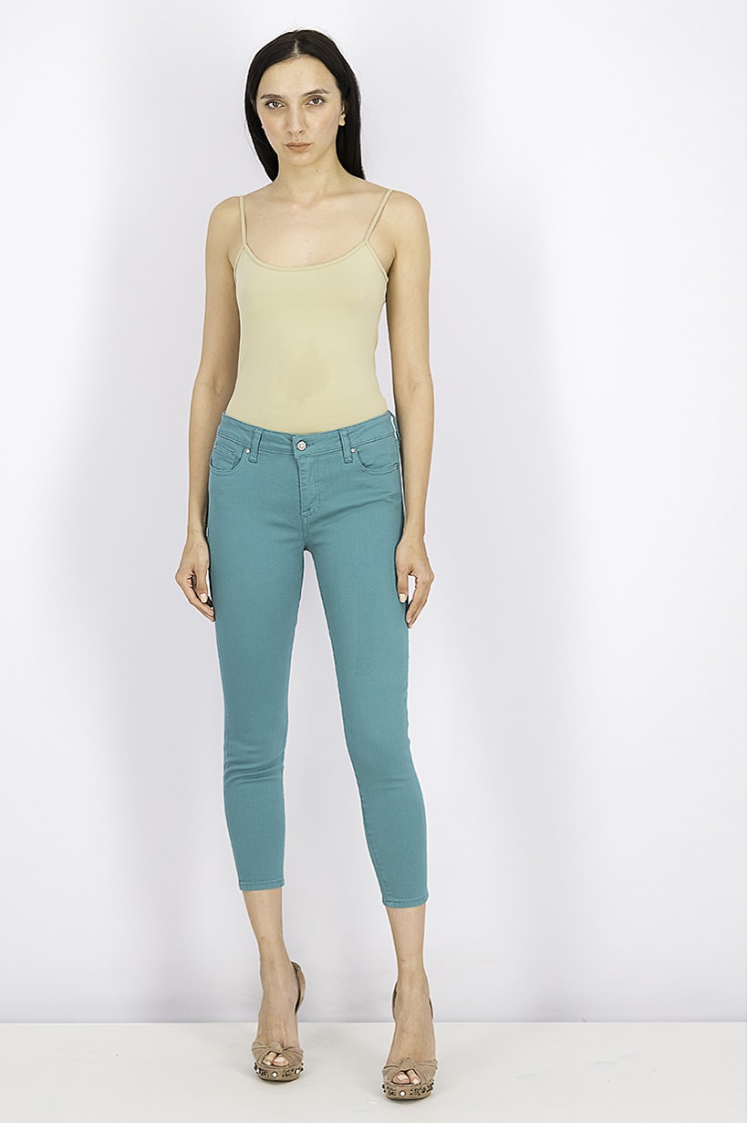 Stretchable solid denim in spearmint color for women’s skinny fit.