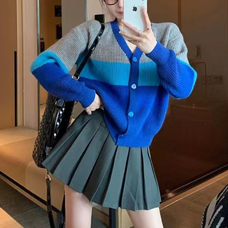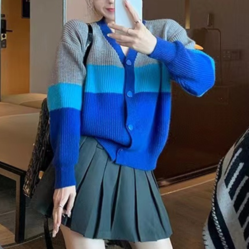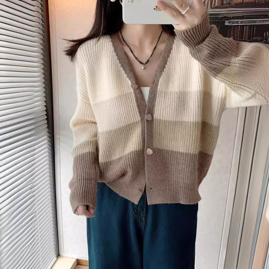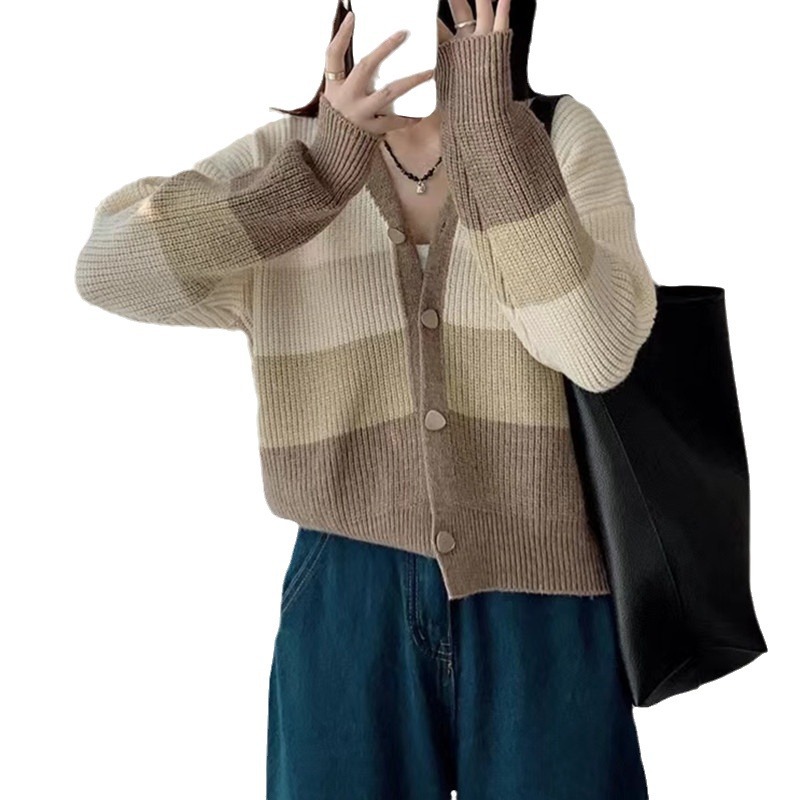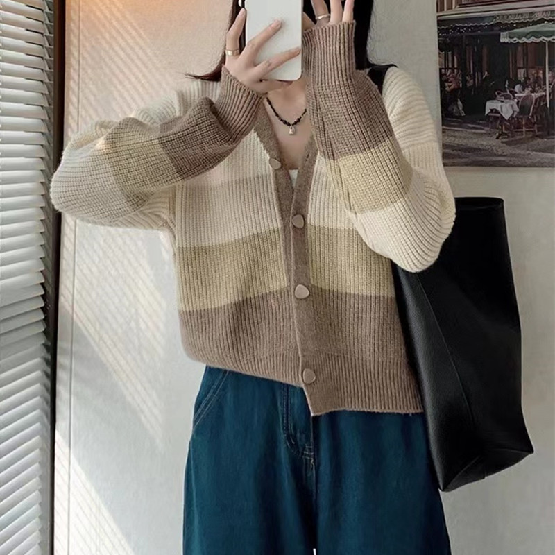 | nameOriginal | Striped color matching milk fufu soft waxy sweater women's 2024 autumn and winter design sense niche retro V-neck cardigan short coat |