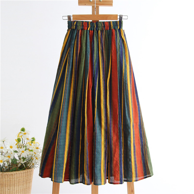 Striped cotton and linen long spring and summer casual skirt