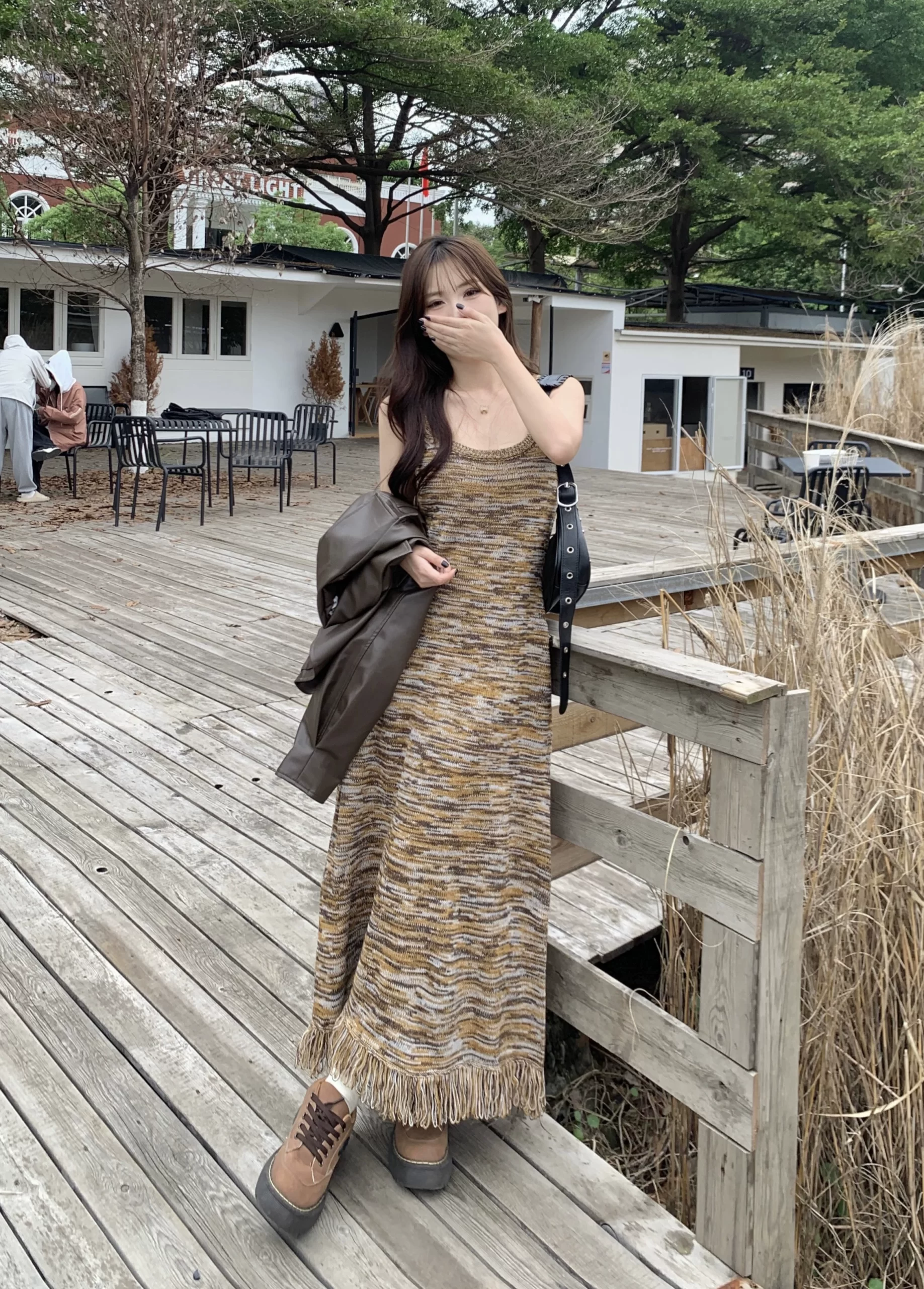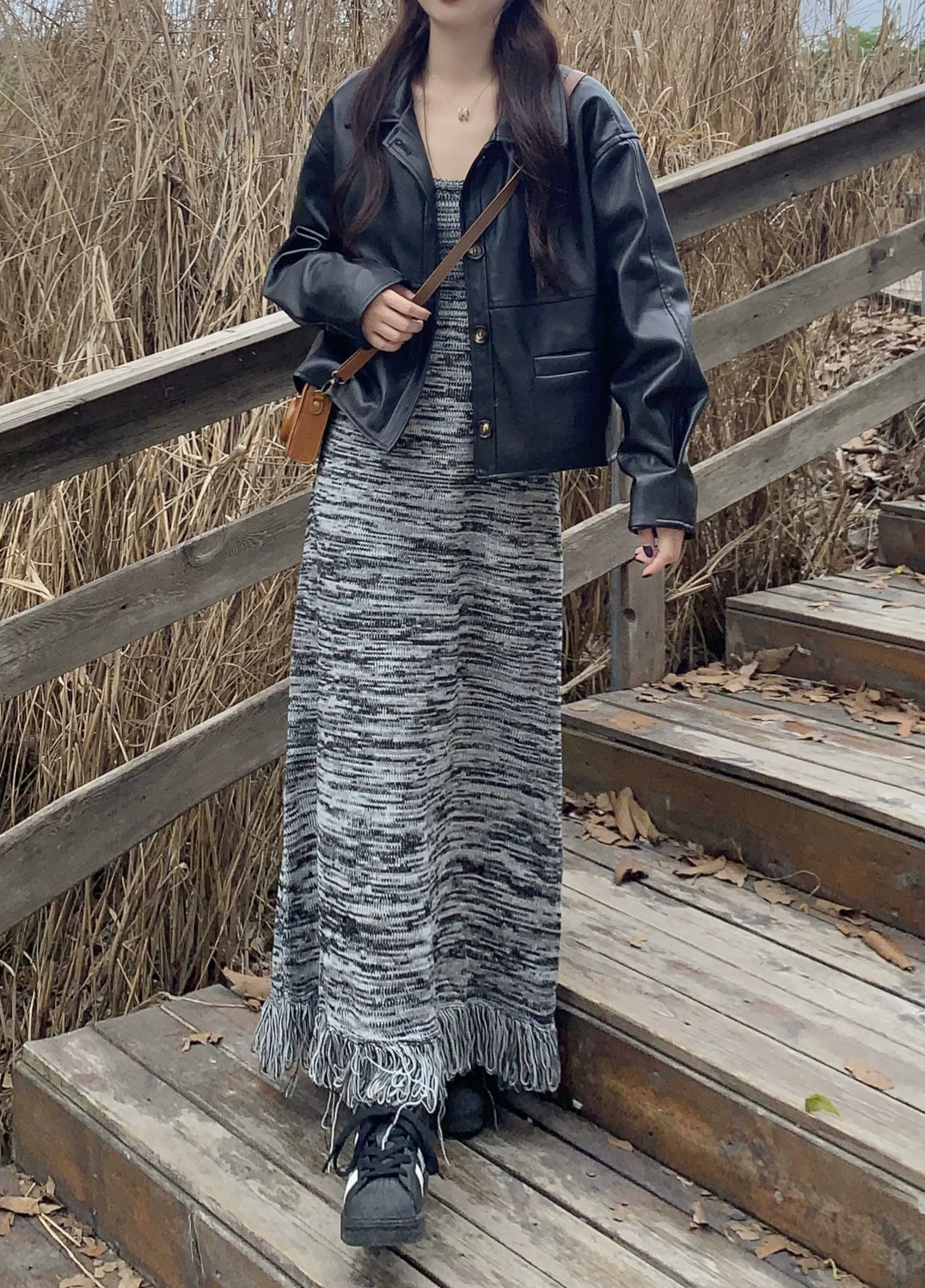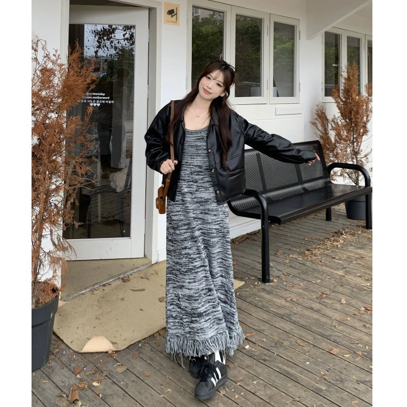 | nameOriginal | Striped fat mm belly-covering slimming tassel suspender dress |