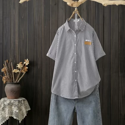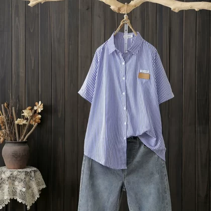 Striped French commuter straight cotton short-sleeved shirt