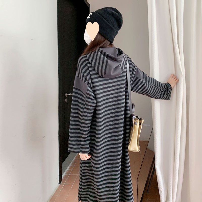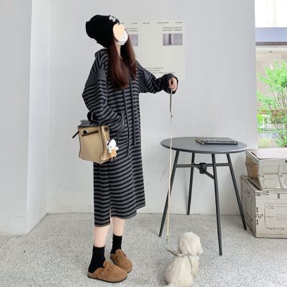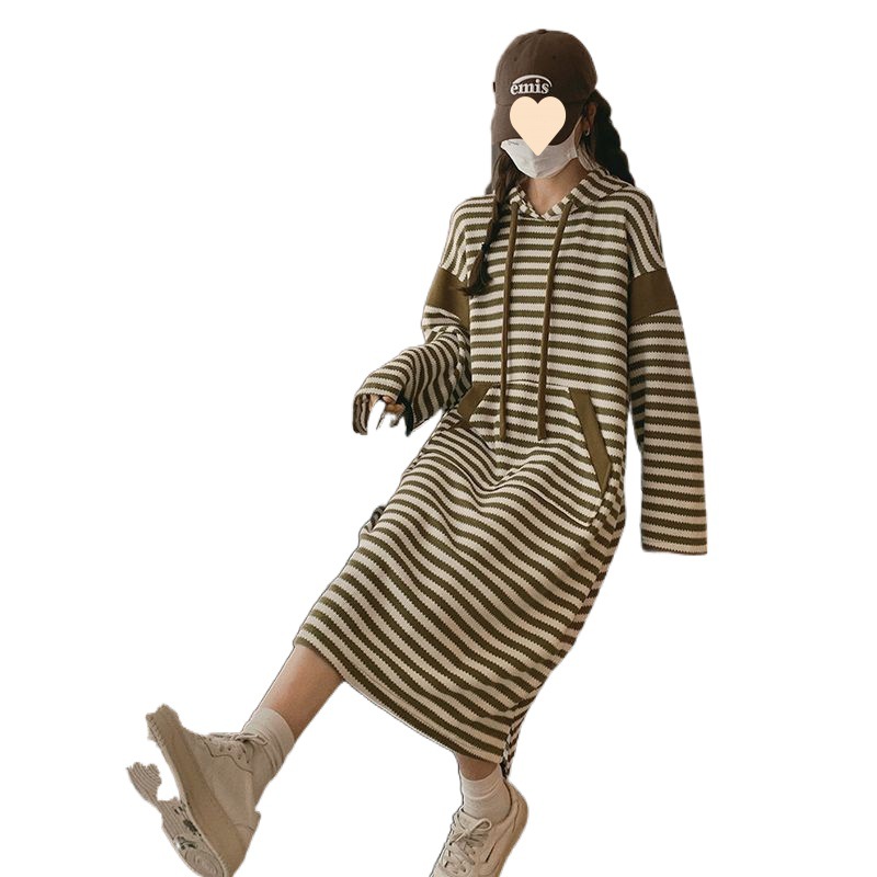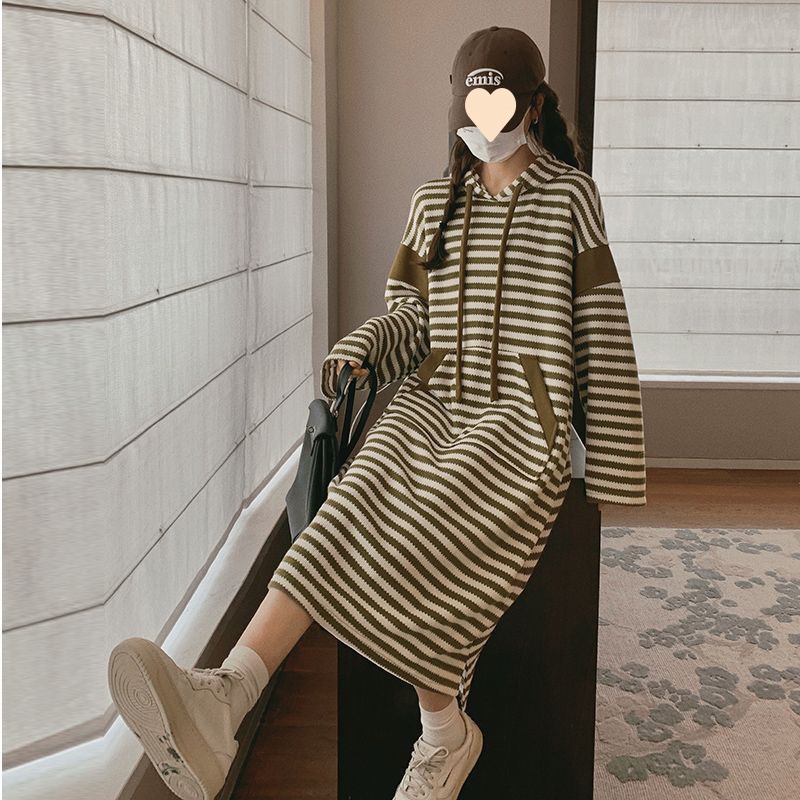 Striped hooded sweater dress women’s spring and autumn 2024 New Korean style lazy college style plus size loose chubby girl