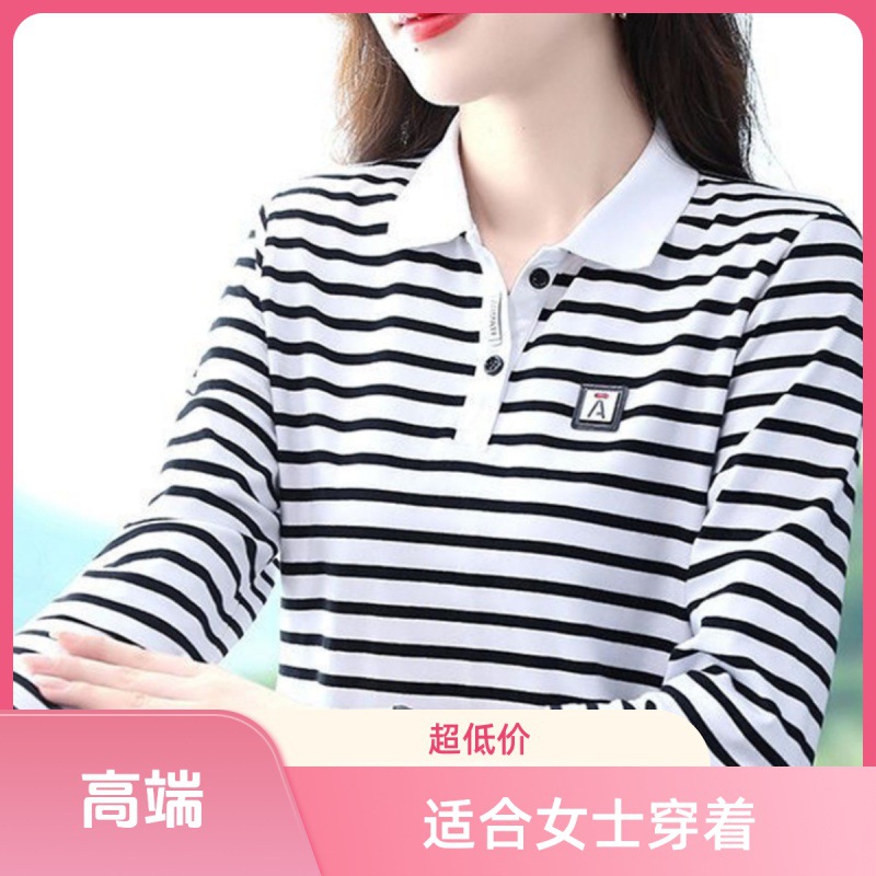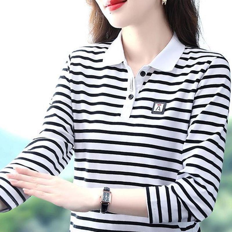 | nameOriginal | Striped lapel women's T-shirt long sleeve 2024 autumn new plus size women's middle-aged mother casual all-match |