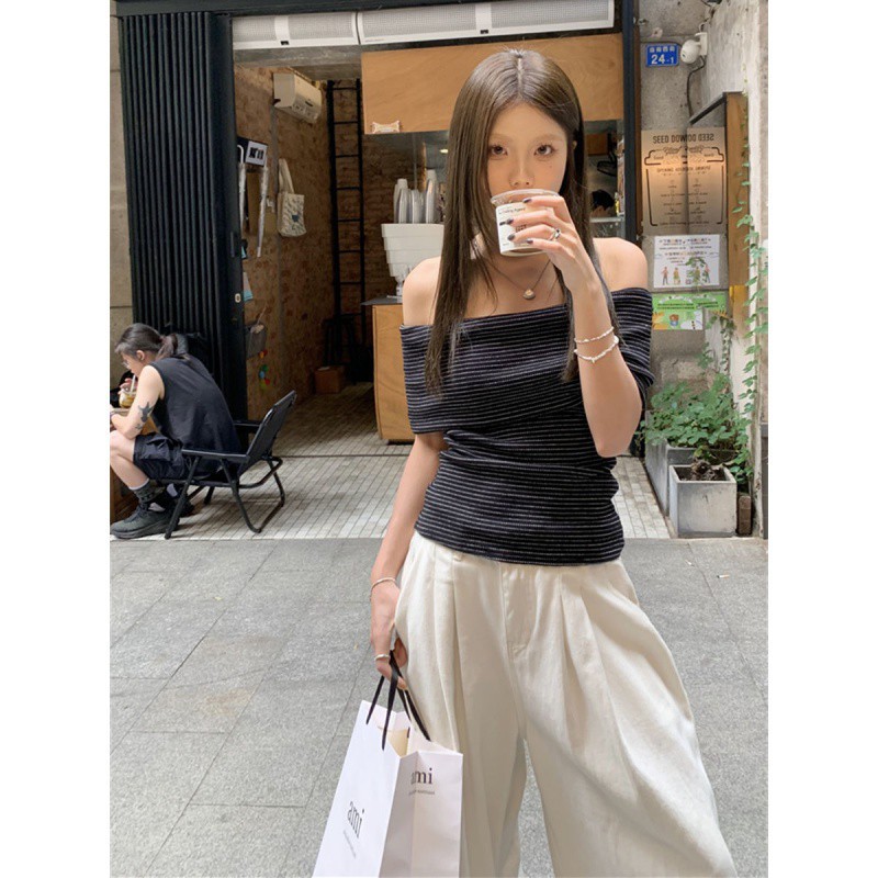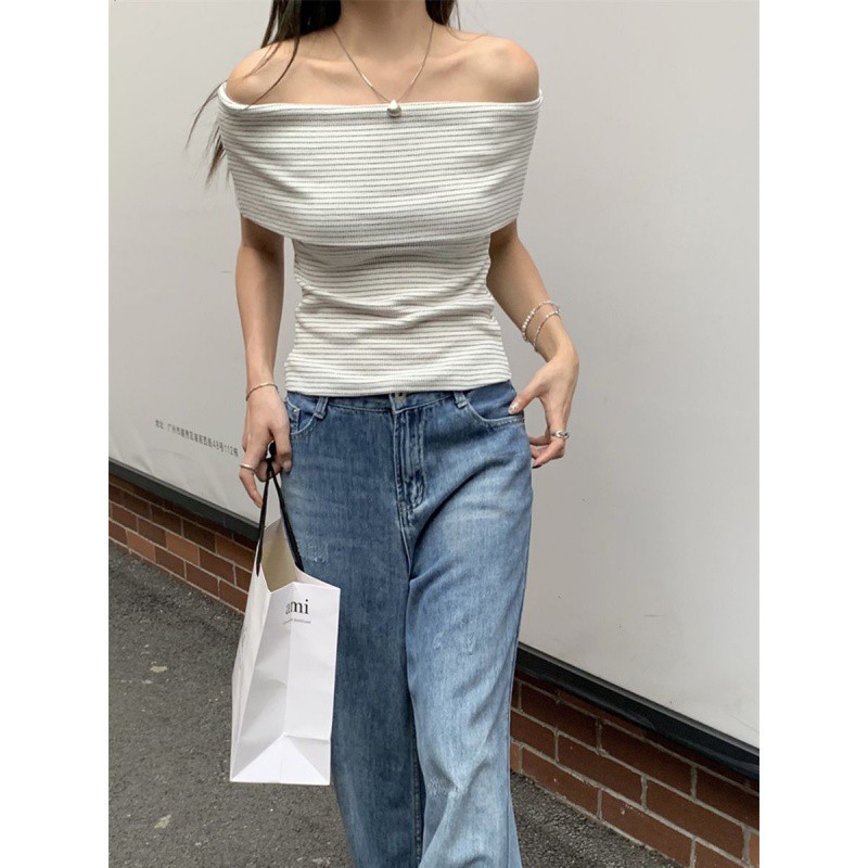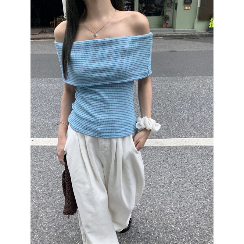 | nameOriginal | Striped off-shoulder knitted short-sleeved shirt women's summer latest western-style slim-fit sweet hot girl short slim-fit trendy top |