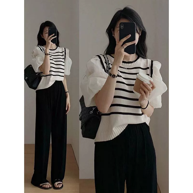 | nameOriginal | Striped right-shoulder knitted short-sleeved fake two-piece t-shirt |