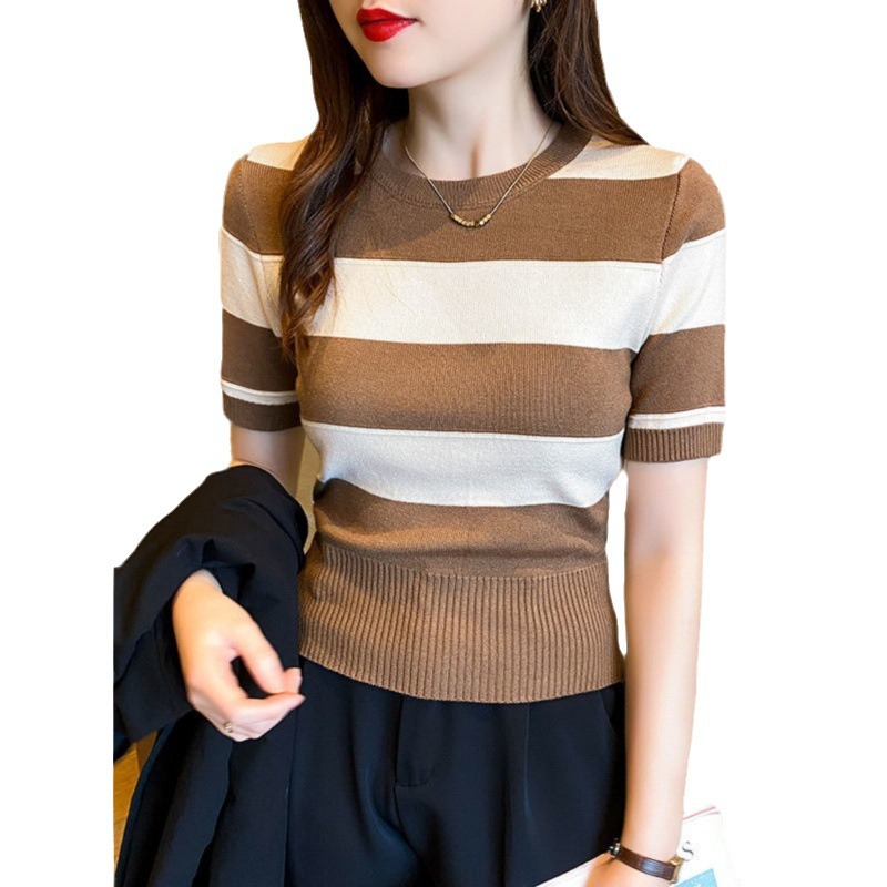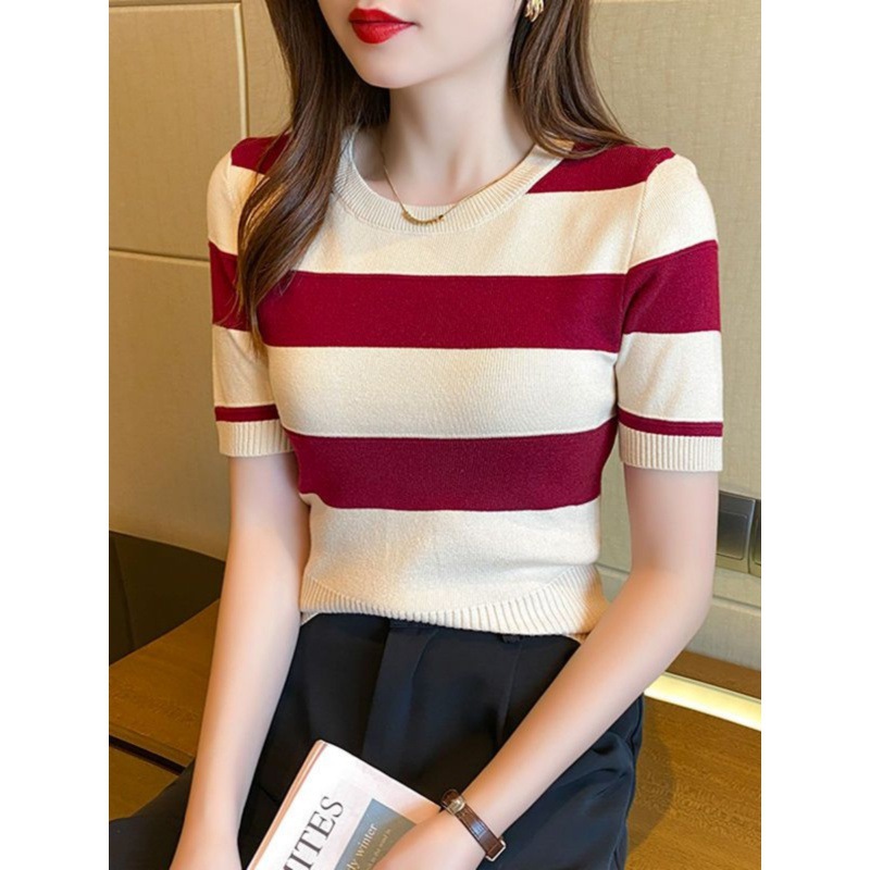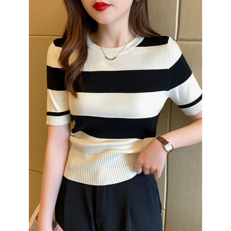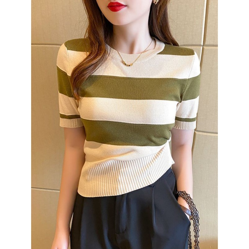 | nameOriginal | Striped Short-sleeved T-shirt Women's Slim-fit Slimming Ice Silk Knitted Sweater for 2023 Summer New Arrival Outer Wear Inner Short Top for Women |