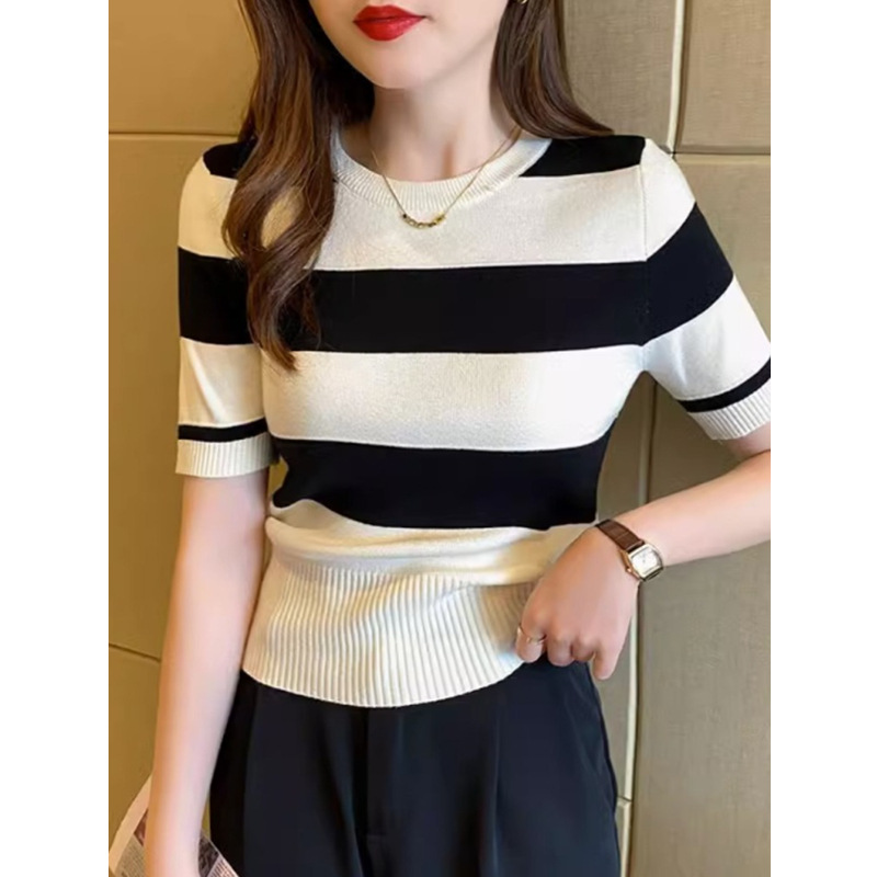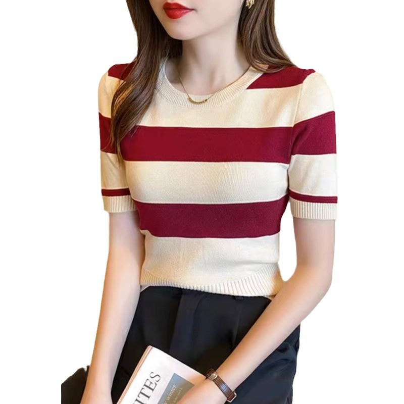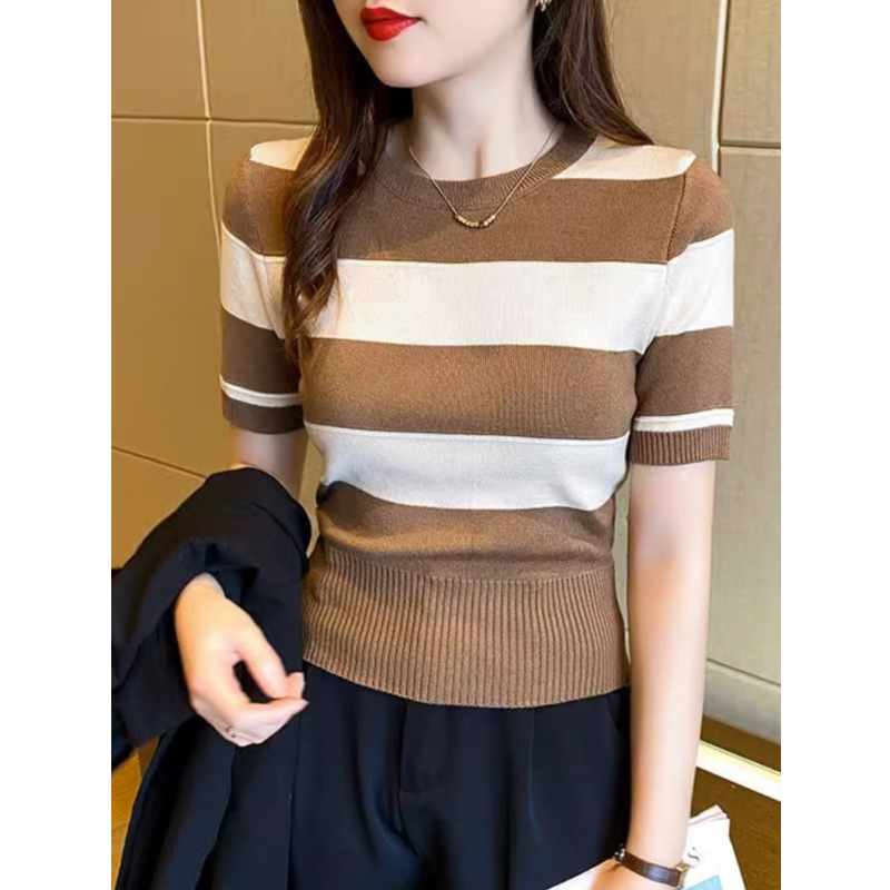 | nameOriginal | Striped Short-sleeved Women's Slim-fit Slimming Ice Silk Knitted Sweater 2024 Summer New Arrival Outer Wear Inner Short All-match Top |
