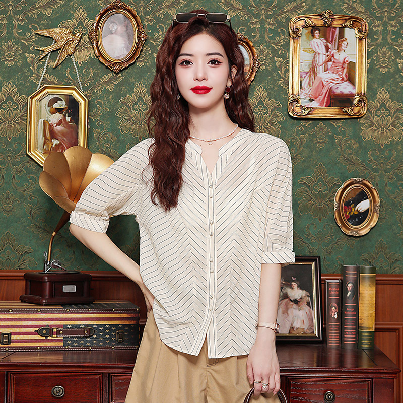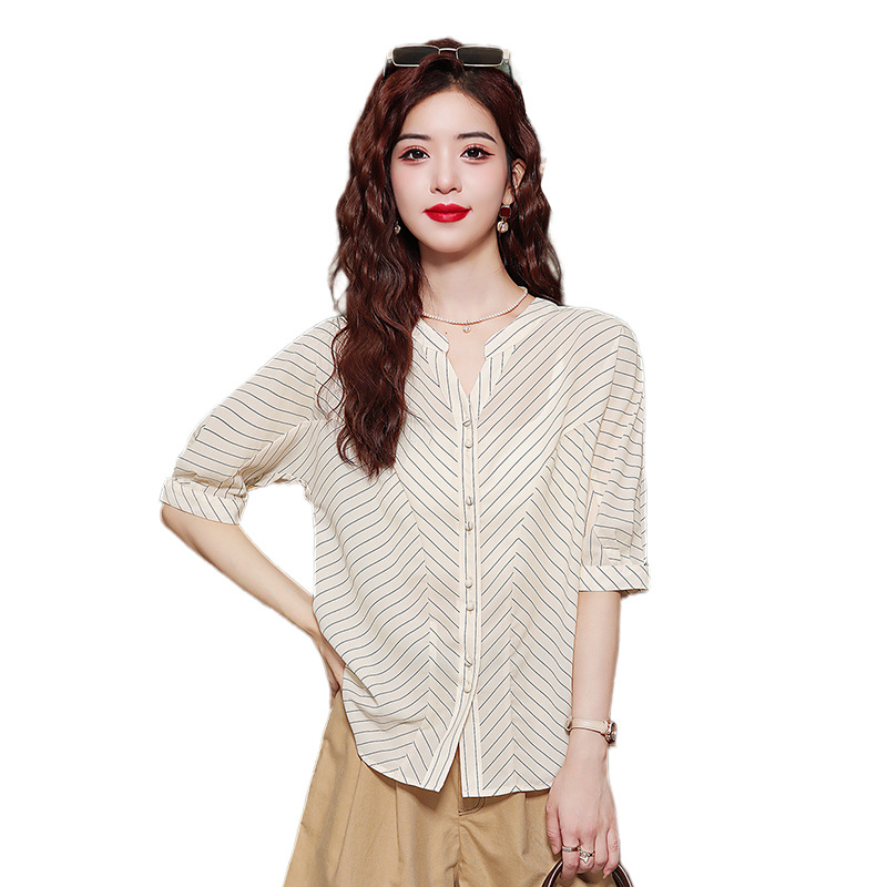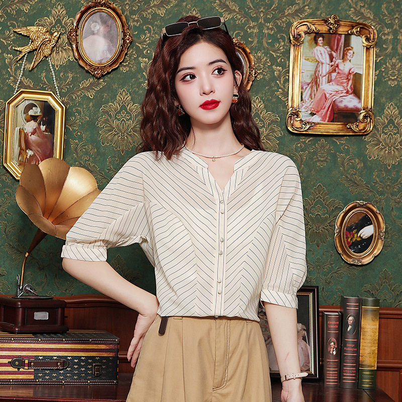 | nameOriginal | Striped Small V-Neck Shirt Top Women's Summer Elegant Elegant Shirt Commuting Simple Half Sleeve Shirt |