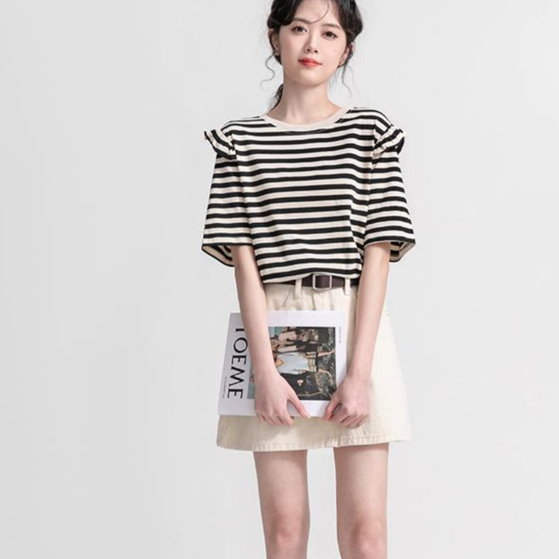 | nameOriginal | Striped splicing ruffle niche loose short-sleeved T-shirt |