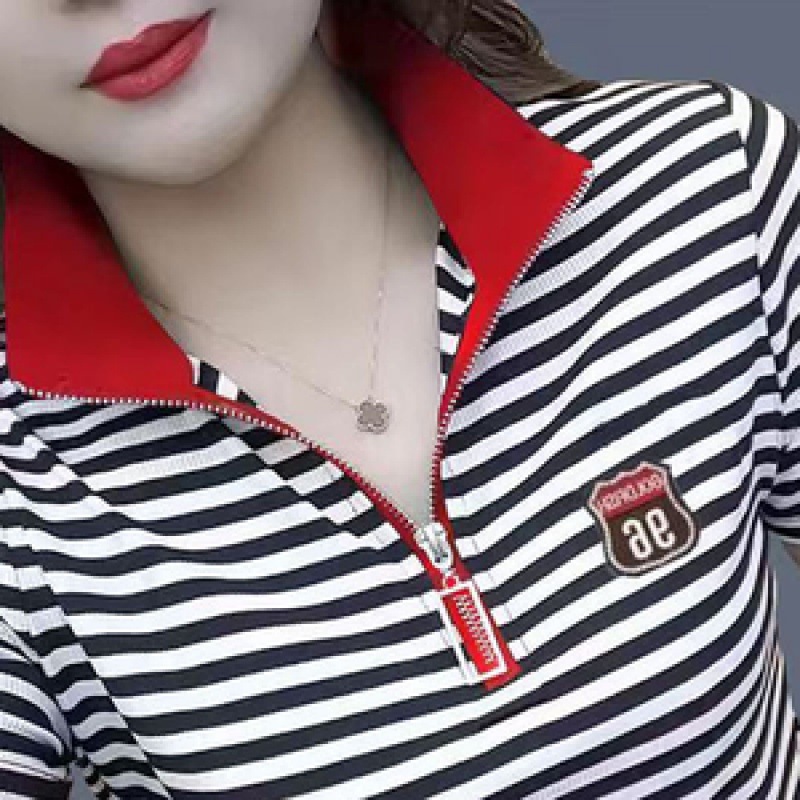 | nameOriginal | Striped T-shirt Women's Short-sleeved 2024 Summer Western Style Zipper Lel Polo Shirt with Vertical Collar Loose plus size Top |