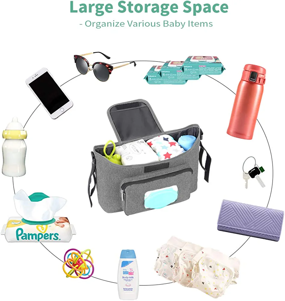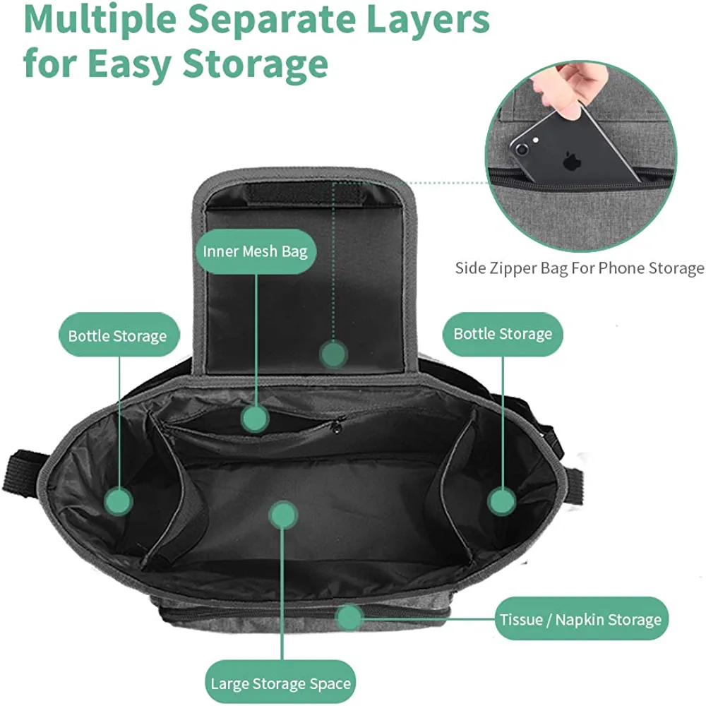 Introducing the Baby Stroller Organizer – the ultimate solution for parents on-the-go! This stroller accessories bag is designed to provide you with ample storage space for all your baby essentials, including bottles, diapers, phones, toys, and more. With multiple zipper pockets and two cup holders, you can easily organize and access everything you need while out and about with your little one.