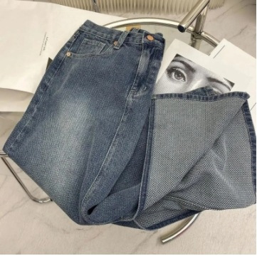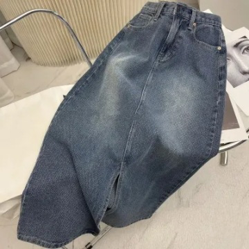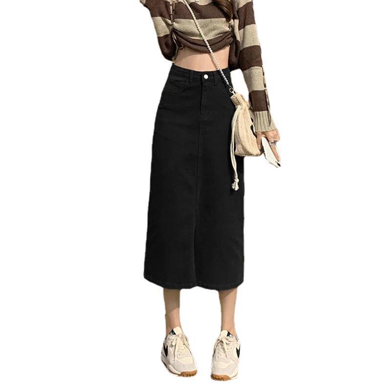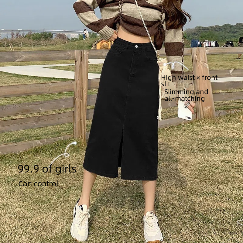Student Denim skirt black A- line split mid-length high waist slimming versatile loose pear-shaped dress trendy