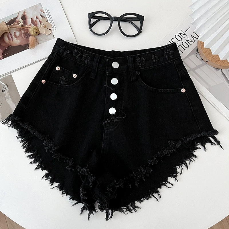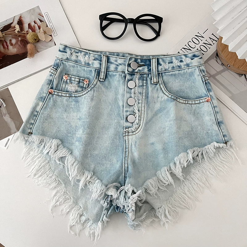 | nameOriginal | Stylish high-waisted single-breasted denim shorts with fringed edges |